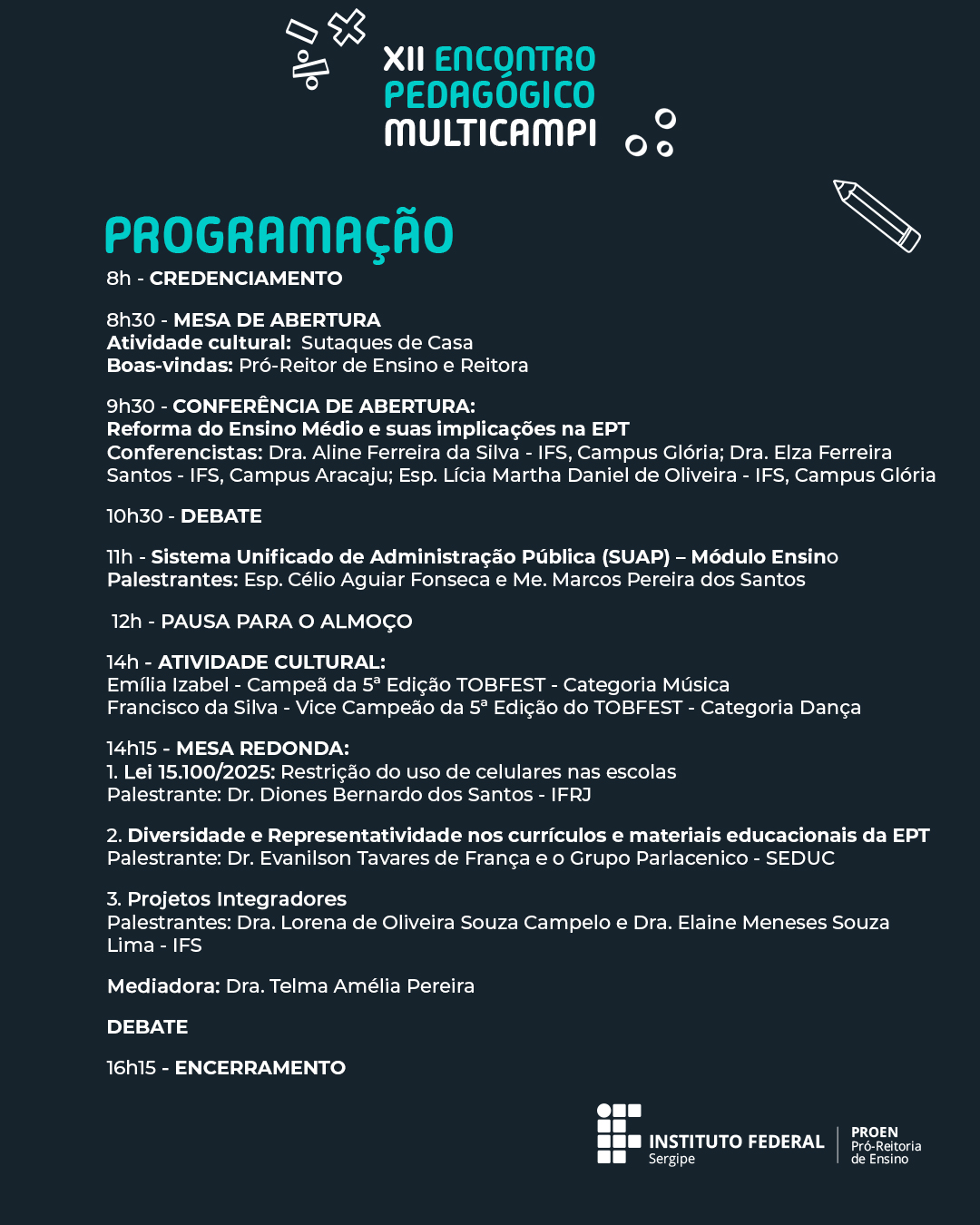 O Instituto Federal de Sergipe (IFS) realizará, no dia 7 de abril de 2025, o XII Encontro Pedagógico Multicampi. A programação ocorrerá das 8h às 12h e das 14h às 17h no Teatro Atheneu, em Aracaju, com foco na temática “Reforma do Ensino Médio e suas implicações na Educação Profissional e Tecnológica (EPT)”. As inscrições podem ser feitas pelo QR Code disponível no card ou diretamente pelo endereço https://suap.ifs.edu.br/eventos/.