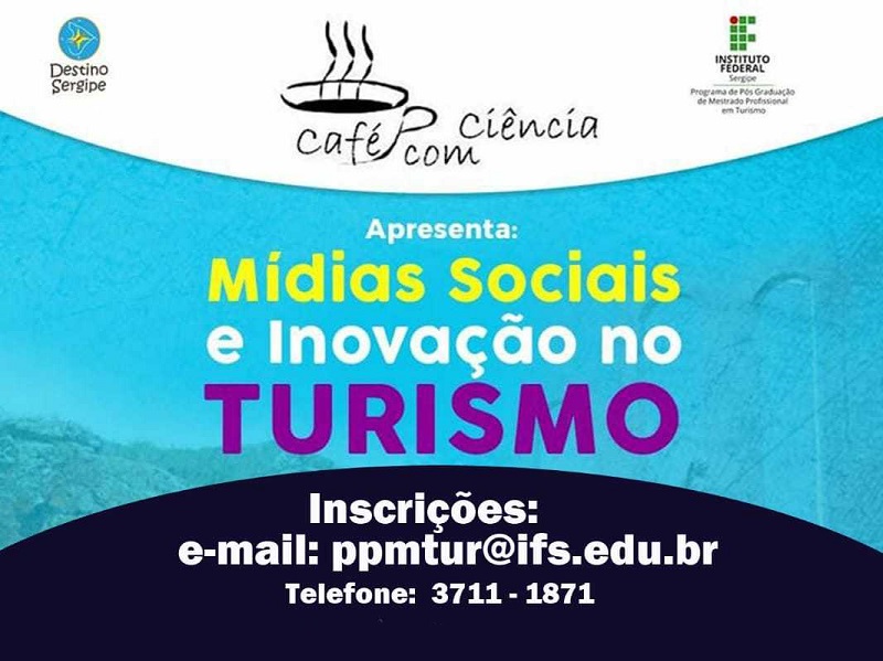 O Programa de Pós-graduação de Mestrado Profissional em Turismo do Instituto Federal de Sergipe (IFS) promoverá mais uma edição do Fórum Permanente de Debates “Café com Ciência”. Com o tema “Mídias Sociais e Inovação em Turismo”, o evento irá ocorrer no dia 13 de setembro, a partir das 14h00, no auditório do Centro de Pós-Graduação do IFS. Podem participar profissionais, professores, pesquisadores e estudantes de turismo.