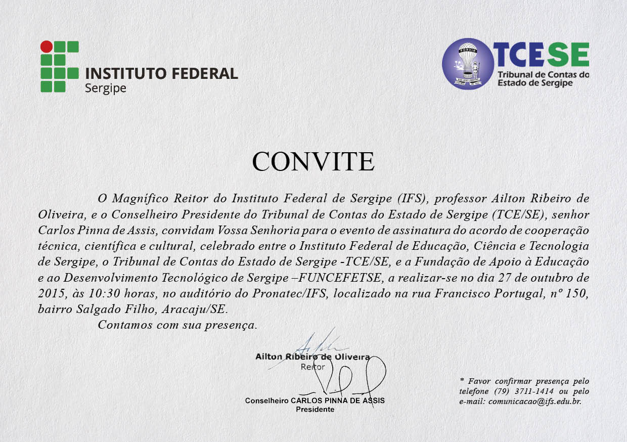 O Instituto Federal de Sergipe (IFS) assina, na manhã desta terça-feira, 27, convênio com o Tribunal de Contas do Estado de Sergipe (TCE/SE) para o desenvolvimento de pesquisas e soluções no Pólo de Inovação do IFS. Em solenidade que ocorrerá no Pronatec, às 10h30, será assinado um Termo de Cooperação Técnica entre IFS, Funcefet e TCE/SE.O acordo tem como objeto o estabelecimento de parceria entre as instituições envolvidas, visando a promoção de ações conjuntas, através do aproveitamento das potencialidades dos órgãos cooperantes, dentro do campo de suas respectivas atribuições de especialidades, no aprimoramento do ensino, pesquisa aplicada, extensão e inovação tecnológica nos setores de interesse dos partícipes, propiciando a otimização do desenvolvimento nas diversas áreas de conhecimento e da gestão institucional.