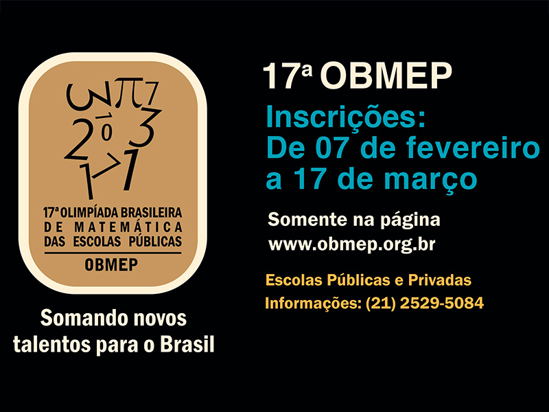 A Olimpíada Brasileira de Matemática das Escolas Públicas é um projeto nacional dirigido às escolas públicas e privadas brasileiras, realizado pelo Instituto de Matemática Pura e Aplicada - IMPA, com o apoio da Sociedade Brasileira de Matemática – SBM, e promovida com recursos do Ministério da Educação - MEC e do Ministério da Ciência, Tecnologia e Inovações– MCTI.