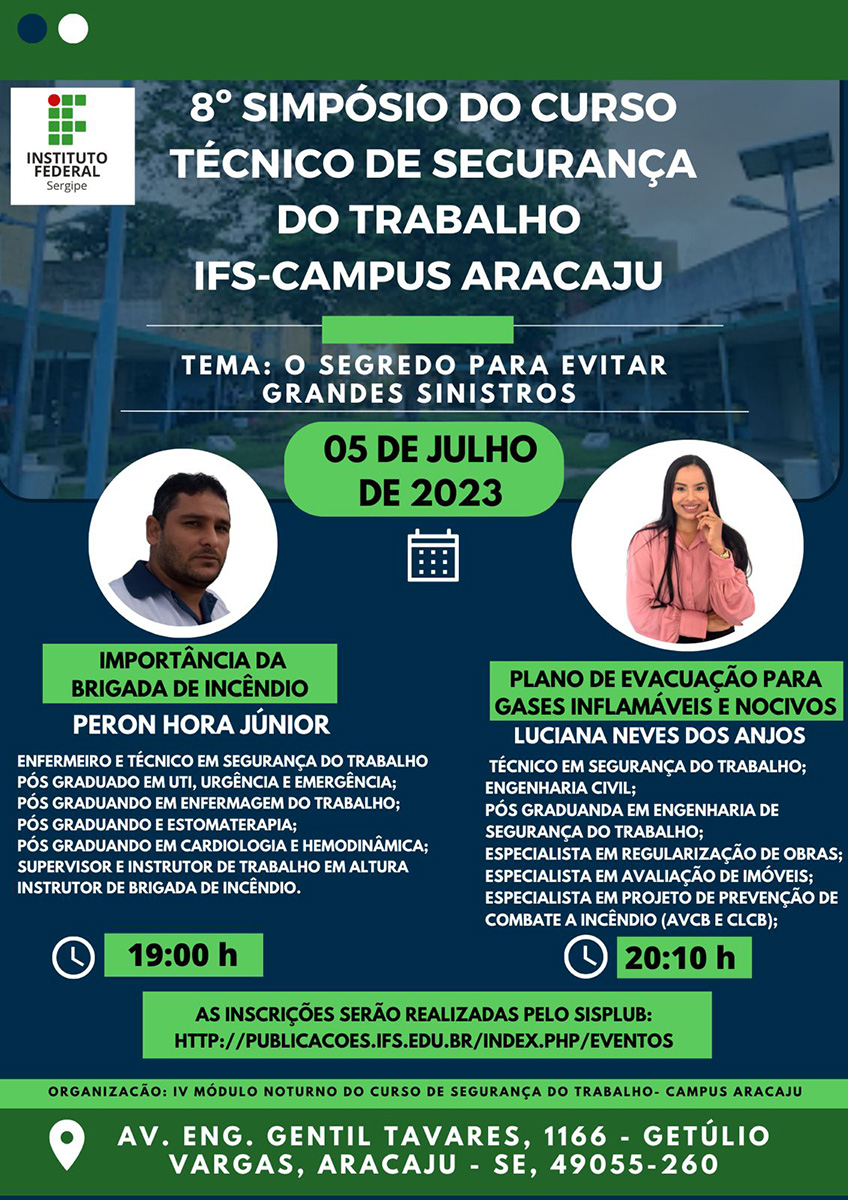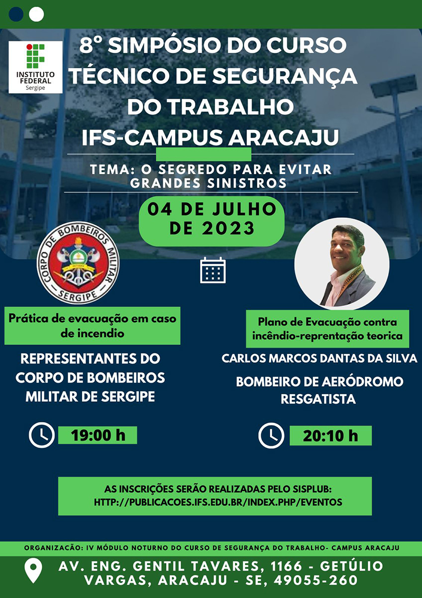 O VIII Simpósio do curso técnico subsequente de Segurança do Trabalho do IFS campus Aracaju, com tema O Segredo para evitar grandes sinistros, será realizado nos dias 4 e 5 de julho, das 19 às 22h, no ginásio de esportes do campus Aracaju. A programação integra o calendário de atividades da Coordenação de Saúde e Segurança do Trabalho do IFS campus Aracaju (COSSET), que desde a primeira edição desenvolve temas voltados para as teorias e práticas de segurança do trabalho, abordados por diversos profissionais e especialistas que atuam nas temáticas escolhidas pela organização do evento.
