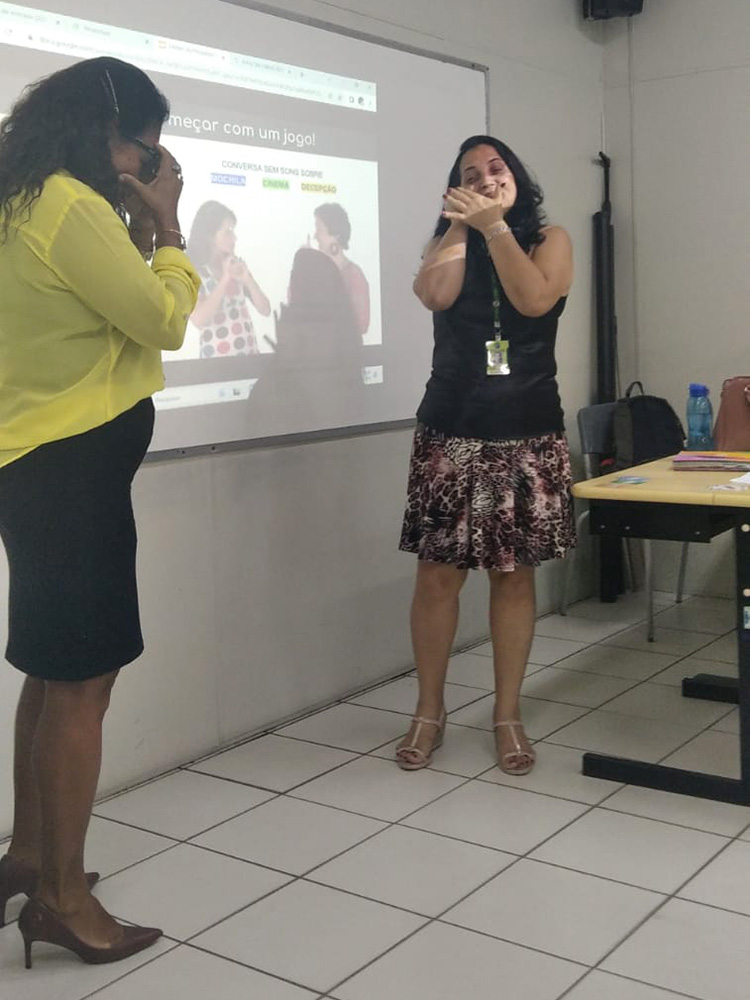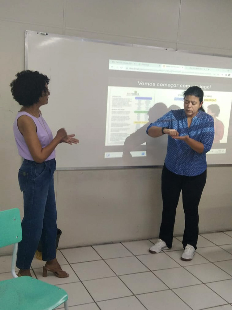 A ação foi realizada com a participação da equipe de tradutoras e intérpretes em Libras do Napne mediando as práticas com o intuito de proporcionar mais segurança para que psicopedagogas e psicólogas, por exemplo, possam vivenciar interações transformadoras com alunos e visitantes no intuito de criar uma instituição mais inclusiva.