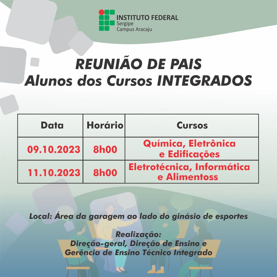 A Direção-geral do campus Aracaju do Instituto Federal de Sergipe (IFS), por meio da Direção de Ensino e a Gerência de Ensino Técnico Integrado, começa a reunir, a partir da próxima segunda-feira, pais dos estudantes dos cursos técnicos, integrado ao ensino médio, para apresentar o desempenho dos alunos no primeiro semestre de 2023. O encontro do dia 9/10 será com os responsáveis pelos discentes Química, Eletrônica e Edificações . Já na quarta-feira, 11, será a vez de Eletrotécnica, Informática e Alimentos. As reuniões iniciam às 8h no espaço que fica ao lado do ginásio de esportes da instituição.