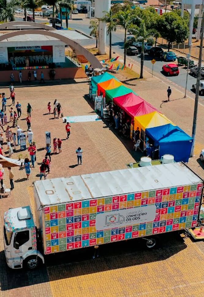 Além disso, ficou claro também o quanto os ODS, apesar de serem constantemente mencionados na mídia, ainda eram pouco conhecidos da população média. Então, veio a ideia: um caminhão itinerante, que estaciona em um espaço público, convida os alunos de escolas públicas e suas redes, dialoga com a comunidade local, e traz uma série de atividades ligadas à disseminação e ao engajamento prático nos ODS. Surgia, em 2019, o Caminhão Conhecendo os ODS com dois objetivos centrais: disseminar o conhecimento sobre os Objetivos de Desenvolvimento Sustentável e transformar o cidadão em agente de mudança em sua comunidade e mundo.