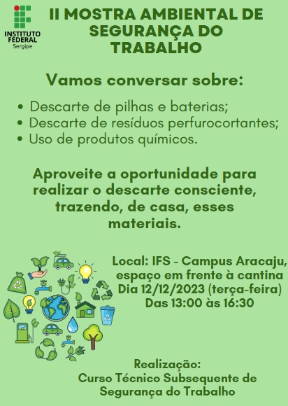 O campus Aracaju do Instituto Federal de Sergipe realizará na próxima terça-feira (12), das 13h às 16h30, na área de convivência do pavilhão Leyda Régis, a segunda edição da Mostra Ambiental de Segurança do Trabalho com o objetivo de sensibilizar a comunidade acadêmica sobre o descarte correto de pilhas, baterias e resíduos perfurocortantes e o uso de produtos químicos. A proposta da atividade é conscientizar o público acerca da importância do cuidado com o meio ambiente.