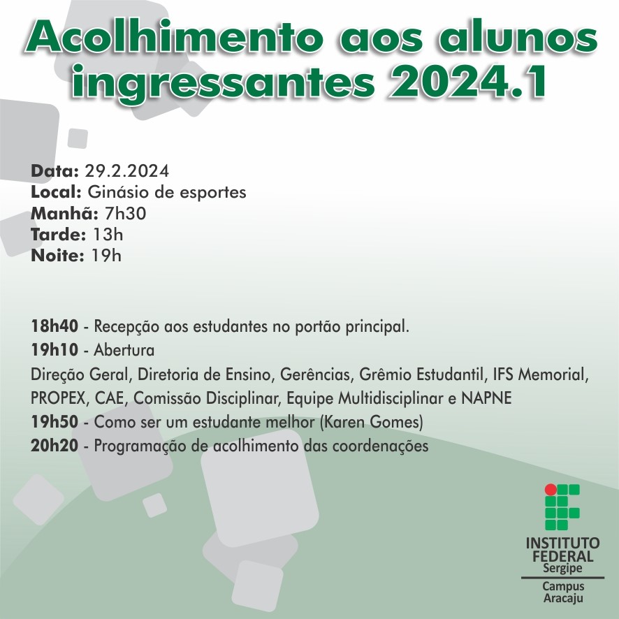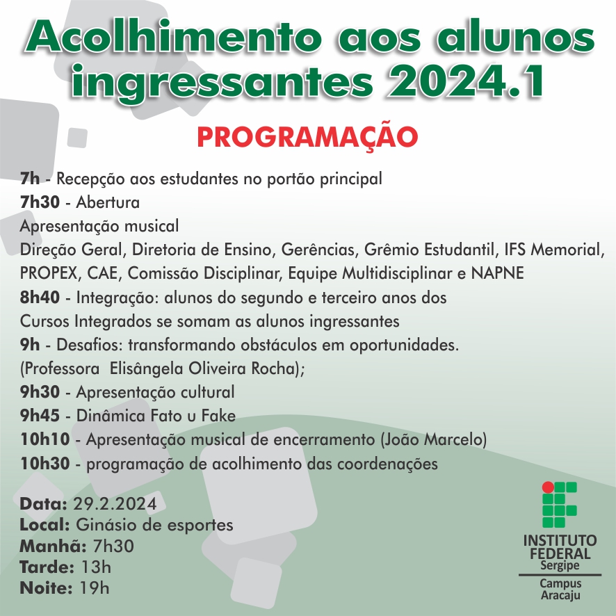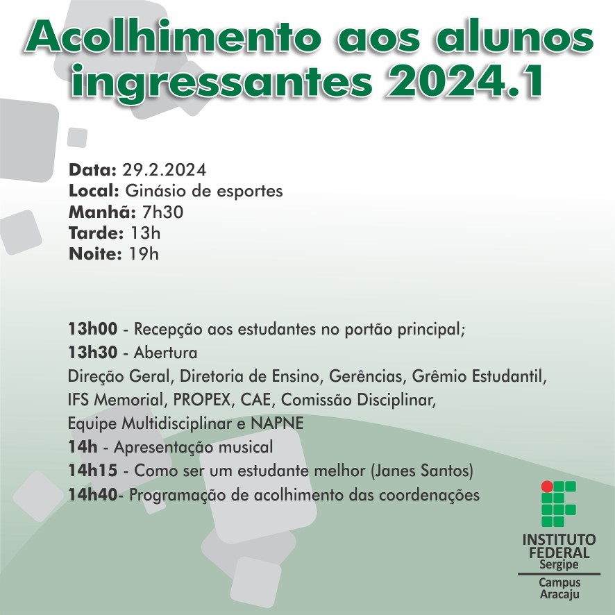 O campus Aracaju realizará nesta quinta-feira, 29.2, às 7h, às 13h e às 19h, no ginásio de esportes Franscisco Martins de Lima, o Acolhimento aos alunos ingressantes 2024.1 dos cursos Técnicos Integrados ao Ensino Médio, Técnicos subsequentes e Graduação. Os alunos devem comparecer de acordo com o horário de seu curso e, não é necessário efetuar inscrição.