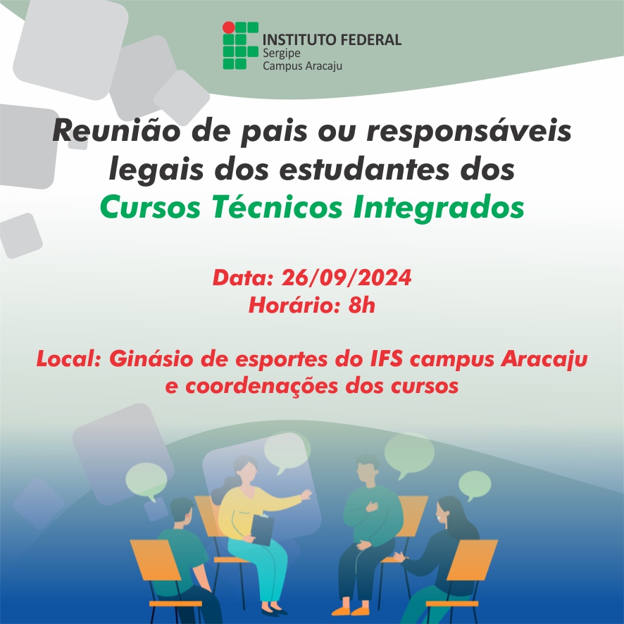 A Direção-geral do Instituto Federal de Sergipe, IFS campus Aracaju, por meio da diretoria de Ensino e a gerência de Ensino Técnico Integrado, reunirá os pais ou responsáveis legais dos estudantes dos seis cursos do ensino médio (Alimentos, Edificações, Eletrotécnica, Eletrônica, Informática e Química) para apresentar o desempenho dos alunos no primeiro bimestre do ano letivo de 2024. O encontro acontecerá na próxima quinta-feira, 26, às 8h, no campus.
