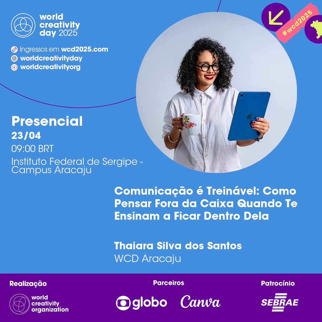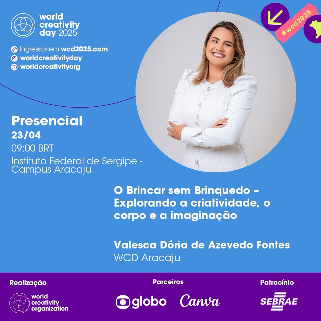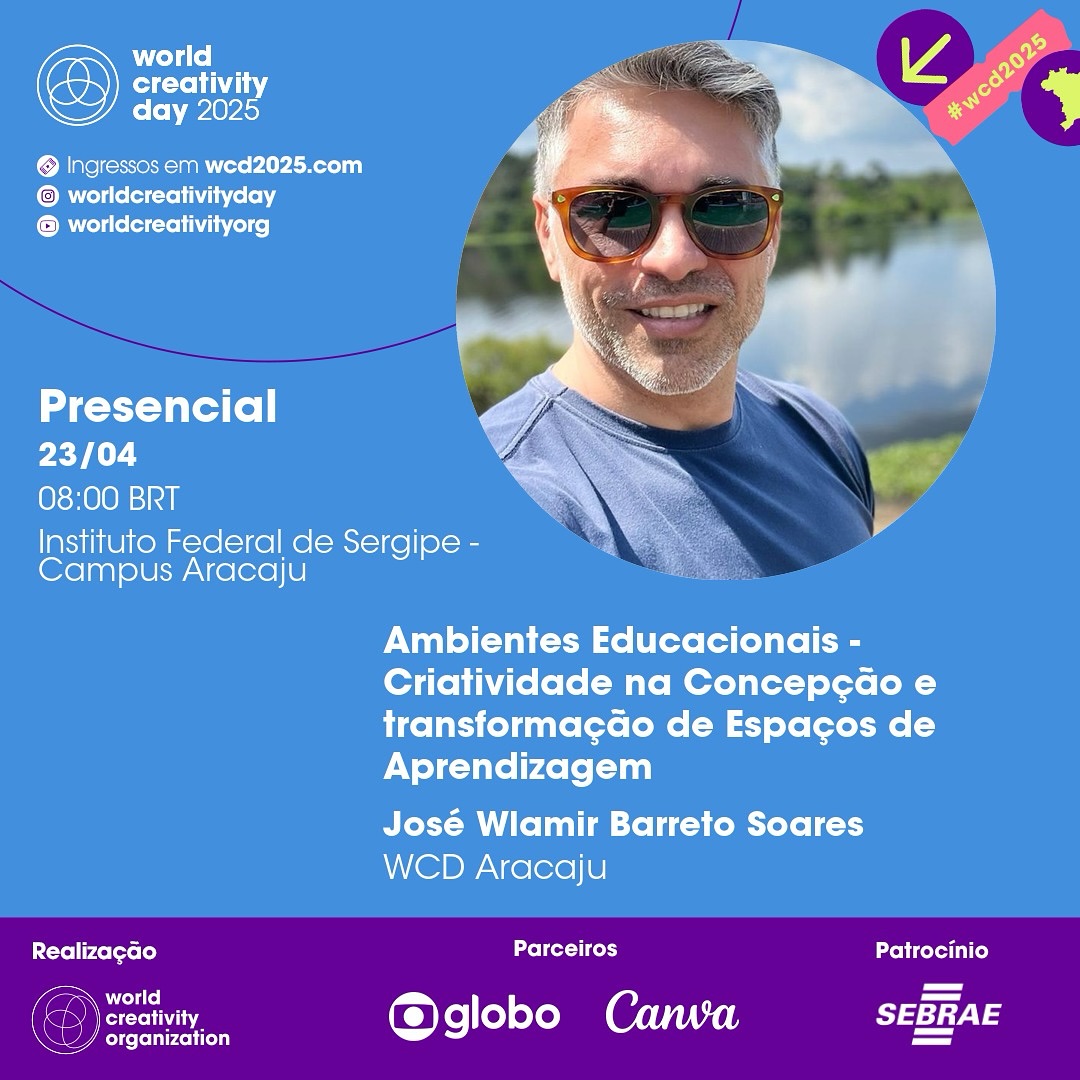 A comunidade acadêmica do campus Aracaju do Instituto Federal de Sergipe (IFS) participará nesta quarta-feira, 23 de abril , do maior festival colabortativo de criatividade e inovação do mundo. As atividades do World Creativity Day 2025 na instituição acontecerão das 8h às 12h, e são abertas ao público externo. As inscrições são gratuitas e deverão ser feitas através do site:https://worldcreativityday.com/brazil/aracaju/activities