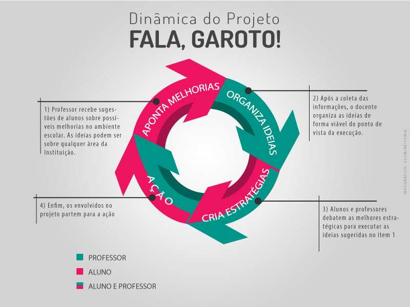 Após a captação das idéias e os ajustes do docente, o “Fala, Garoto!” ganhou contornos amplos e passou a prever intervenções em diversas áreas - como a redução do barulho na biblioteca, orientação na utilização dos equipamentos de informática, disponibilização de espaços para fumantes e a viabilização de estacionamento para bicicletas e motos. “A idéia é que os alunos se conscientizem de tal modo que passem a agir como fiscalizadores. Quando virem outro estudante se comportando de forma inadequada com o patrimônio público, intervenham”, explica o professor. Para fazer parte do projeto, os estudantes regularmente matriculados podem se inscrever como voluntários.