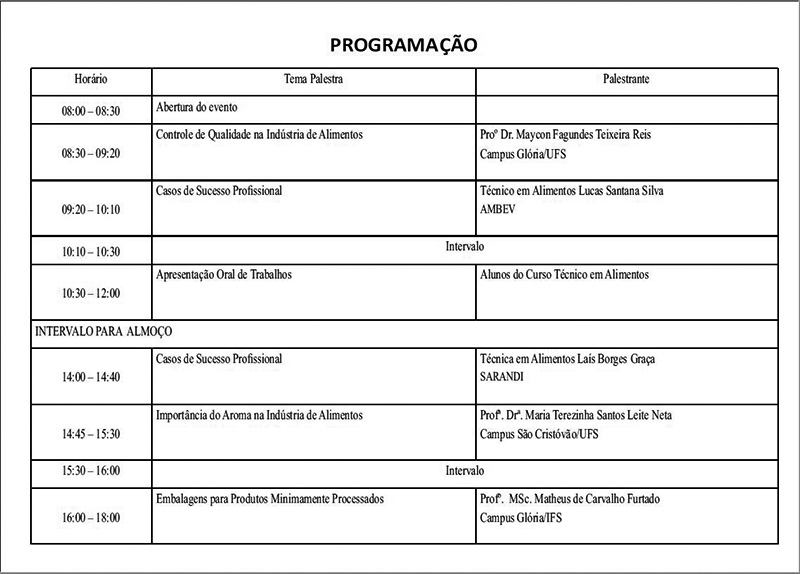 O evento contará com palestras, apresentação de experiências, relatos de casos de sucesso e apresentação oral de trabalhos. No turno da manhã, haverá a palestra “Controle de qualidade na indústria de alimentos” proferida pelo professor doutor Maycon Fagundes Teixeira Reis, do campus Glória da Universidade Federal de Sergipe, apresentação de caso de sucesso, pelo técnico em alimentos da Ambev, Lucas Santana, e apresentação oral de trabalhos, pelos alunos do curso técnico em Alimentos.