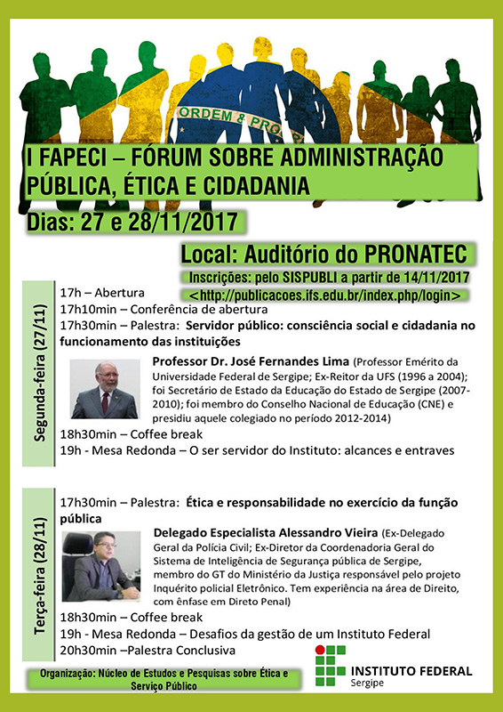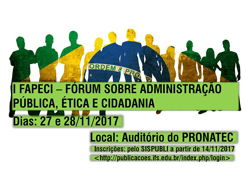 Promovido pelo Núcleo de estudos e pesquisas sobre ética e serviço público (Nepesp), do Campus Aracaju, o I Fórum sobre administração pública, ética e cidadania (Fapeci) será realizado nos dias 27 e 28 de novembro, no auditório do antigo Pronatec, das 17 às 21h. As inscrições são gratuitas e são realizadas pelo Sistema de Publicações do IFS(Sispubli) até o dia 28.