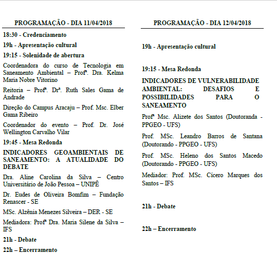 O primeiro dia do evento terá mesa redonda, seguido de debate, sobre Indicadores Geoambientais de Saneamento: A atualidade do debate, com participações da professora doutora Aline Carolina da Silva, do Centro Universitário de João Pessoa – UNIPÊ, doutor Eudes de Oliveira Bomfim, da Fundação Renascer de Sergipe e a mestre Alzênia Menezes Silveira, do Departamento de Estradas de Rodagem – DER. A professora doutora Maria Silene da Silva do IFS atuará como mediadora.