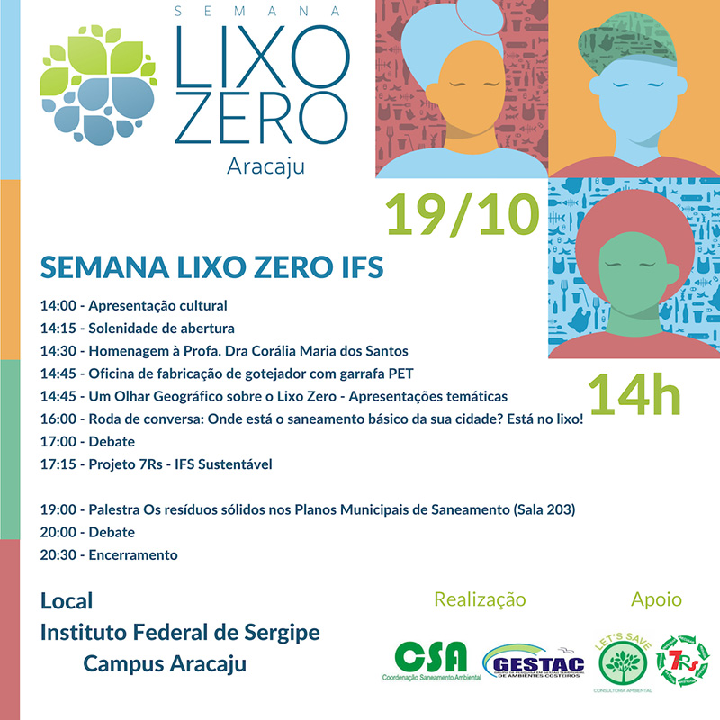 O IFS traz a temática: Onde está o saneamento básico da sua cidade? Está no lixo!. As atividades são gratuitas e direcionadas à comunidade acadêmica. “Com este evento, aposta-se claramente na ideia central de que o Lixo Zero é, antes de mais nada, uma atitude cidadã!”, afirma o professor doutor José Wellington Carvalho Vilar, coordenador do Curso Superior de Tecnologia em Saneamento Ambiental e um dos organizadores da atividade. “Esperamos mobilizar a comunidade acadêmica sobre a importância de práticas sustentáveis com os resíduos sólidos.