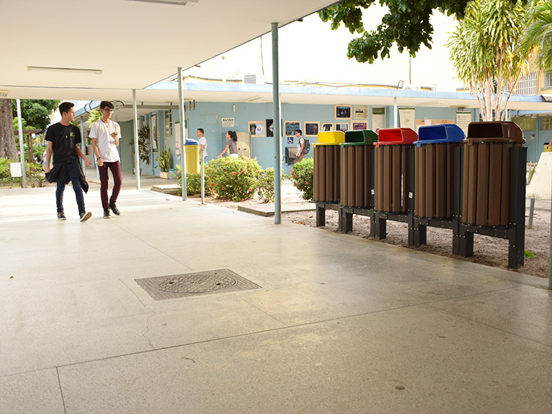 Em mais uma ação visando contribuir com o fomento e prática da sustentabilidade ambiental, a direção-geral do Instituto Federal de Sergipe - campus Aracaju instalou em diversos ambientes os conjuntos de 21 lixeiras ecológicas com suporte e em material ecoplástico. Os recipientes são identificados para recebimento de papel, vidro, plástico , orgânico e metal.