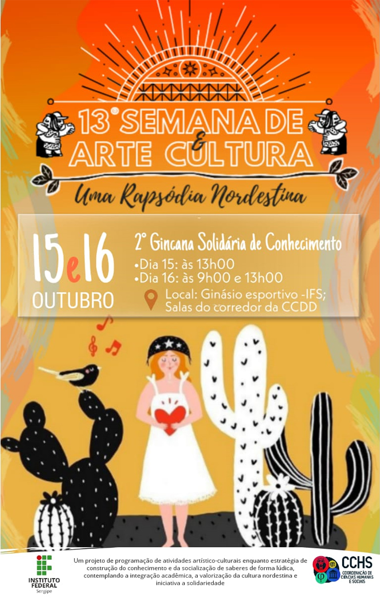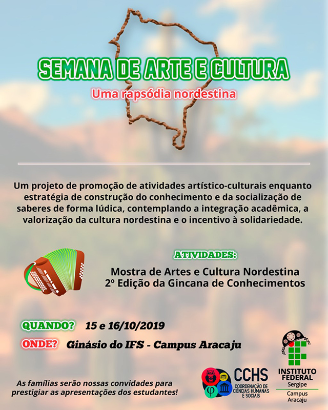 Composta por duas atividades, mostra de artes e cultura nordestina e a 2ª edição da Gincana solidária de conhecimentos, a semana de cultura: uma rapsódia nordestina tem como público alvo os alunos dos cursos técnicos integrados ao ensino médio e suas famílias, que estão convidadas como público especial que darão uma configuração importante ao evento. Veja a programação completa.