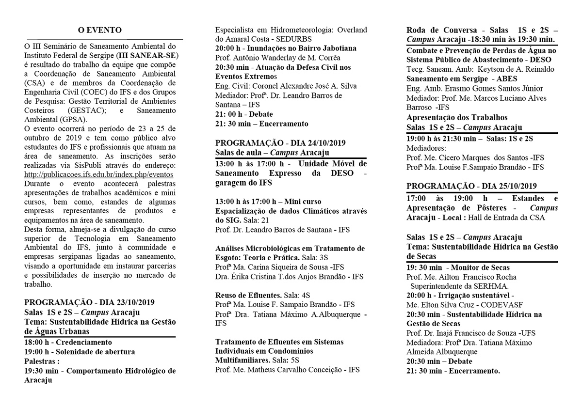 A terceira edição do Sanear terá palestras, minicurso, roda de conversa e apresentação de trabalhos científicos. Todas as atividades serão realizadas no campus Aracaju do IFS. O evento é promovido anualmente pelas Coordenadorias de Saneamento Ambiental (CSA) e Engenharia Civil (Coec) , Grupo de Pesquisa em Saneamento Ambiental (GPSA) e Grupo de Estudos em Gestão Territorial em Ambientes Costeiros (Gestac).