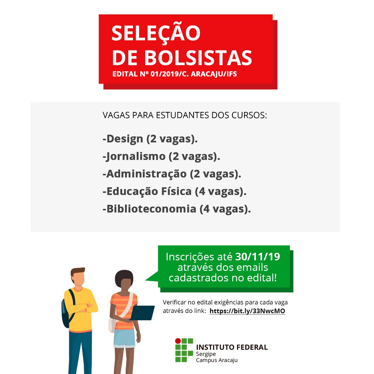 O Instituto Federal de Sergipe, campus Aracaju, está com 14 vagas abertas para estudantes de graduação atuarem como bolsistas em projetos de extensão desenvolvidos nos setores da instituição. Para as áreas de design, jornalismo e administração são ofertadas duas vagas, cada. Já educação física e biblioteconomia são quatro vagas, cada. Os candidatos devem ter disponibilidade de 20 horas semanais.