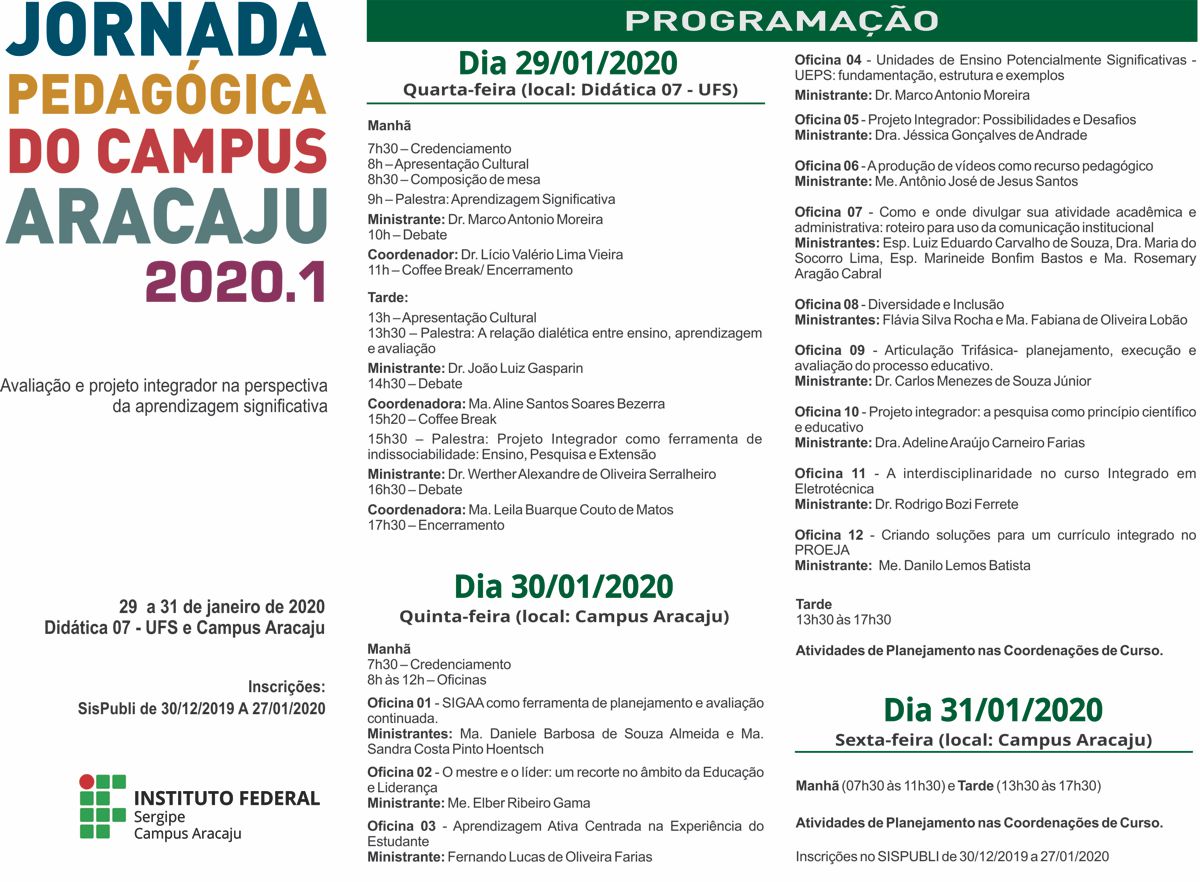 A jornada pedagógica do campus Aracaju é um evento realizado na semana anterior ao início das atividades acadêmicas de cada semestre e, reúne os professores, alunos dos programas de mestrado, pedagogos e técnicos em assuntos educacionais, com vistas à reflexão sobre os desafios teóricos e metodológicos enfrentados nas práticas pedagógicas da educação profissional e tecnológica (EPT).