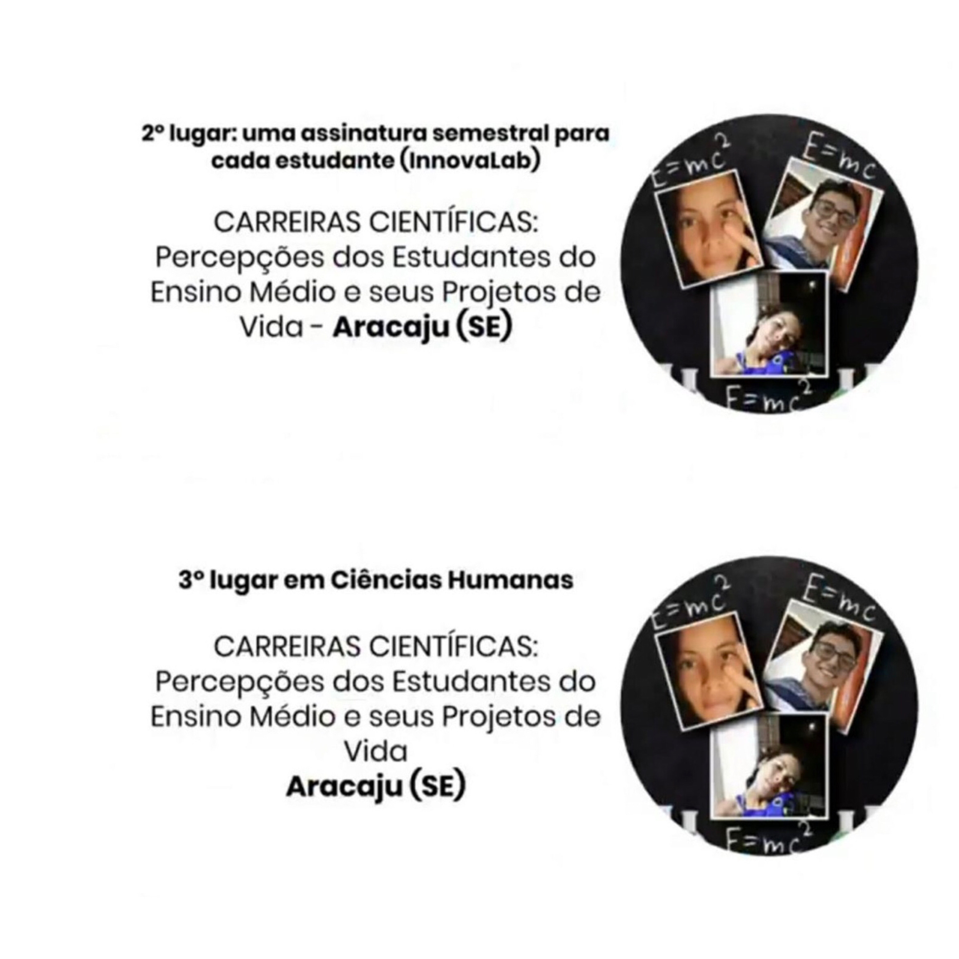 O trabalho Carreiras Científicas: percepções dos estudantes do ensino médio e seus projetos de vida foi apresentado pelos estudantes Camille Vitória de Jesus Porto, Helen Beatriz Leandro Brito e Kauan Rodrigo dos Santos. O grupo ganhou o 2° lugar na premiação de um dos patrocinadores, o InnovaLab, uma empresa de educação inovadora sediada em São Francisco (EUA), que prepara estudantes com conhecimentos das áreas de tecnologia com o suporte dos melhores mentores do Vale do Silício e do mundo. A equipe também conquistou o 3° lugar na premiação oficial da feira, na categoria Ciências Humanas.