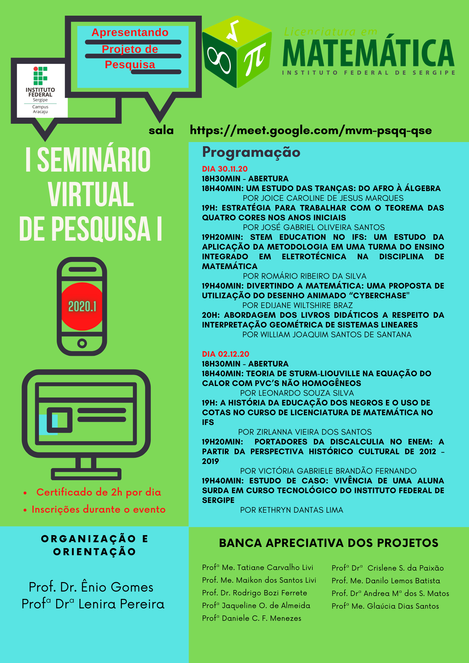 O I Seminário Virtual de Pesquisa, organizado e coordenado pelo professor doutor Ênio Gomes Araujo e professora doutora Lenira Pereira da Silva, da Coordenadoria de Licenciatura em Matemática, Colima, proporcionou aos estudantes aprendizado na apresentação de seus projetos de pesquisa construídos durante todo o semestre letivo de 2020.1.