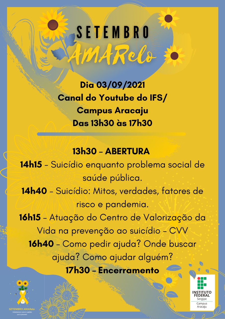 Setembro Amarelo: Informando sobre suicídio para prevenir é uma ação organizada pela Gerência de Ensino Técnico Integrado ao Ensino Médio do Instituto Federal de Sergipe, campus Aracaju, para tratar sobre o problema social de saúde pública, com vistas a sensibilizar a comunidade acadêmica do IFS acerca dos perigos e possibilidades de prevenção. A atividade acontecerá em 3 de setembro, com transmissão na plataforma do YouTube, no Canal do IFS – Campus Aracaju, das 13h30 às 17h30, conforme programação.