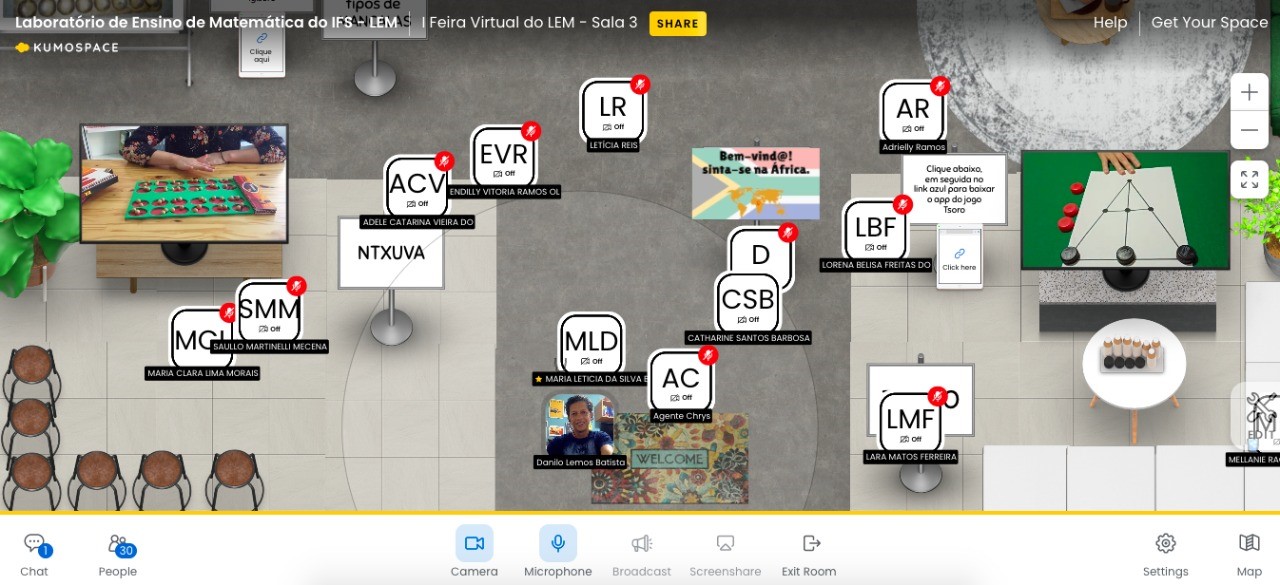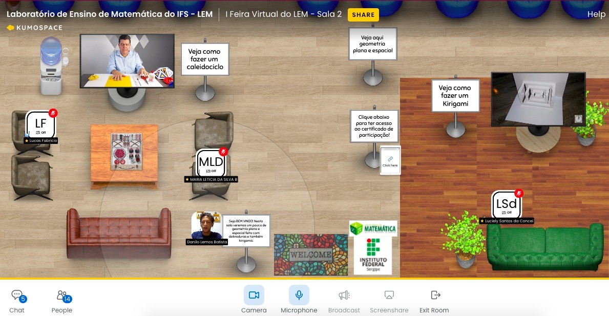 A Coordenadora do Laboratório de Ensino Matemática (LEM) do Instituto Federal de Sergipe, campus Aracaju, realizou, nos dias 8 e 9 de setembro, uma feira virtual no ambiente https://www.kumospace.com/laboratorio, plataforma que permite a criação de espaços interativos que simulam ambientes físicos e adota um modelo de interação semelhante aos jogos multiplayer online. As salas da I Feira Virtual do LEM permanecerão abertas para visitantes até sábado (18), mas sem o acompanhamento simultâneo dos alunos.