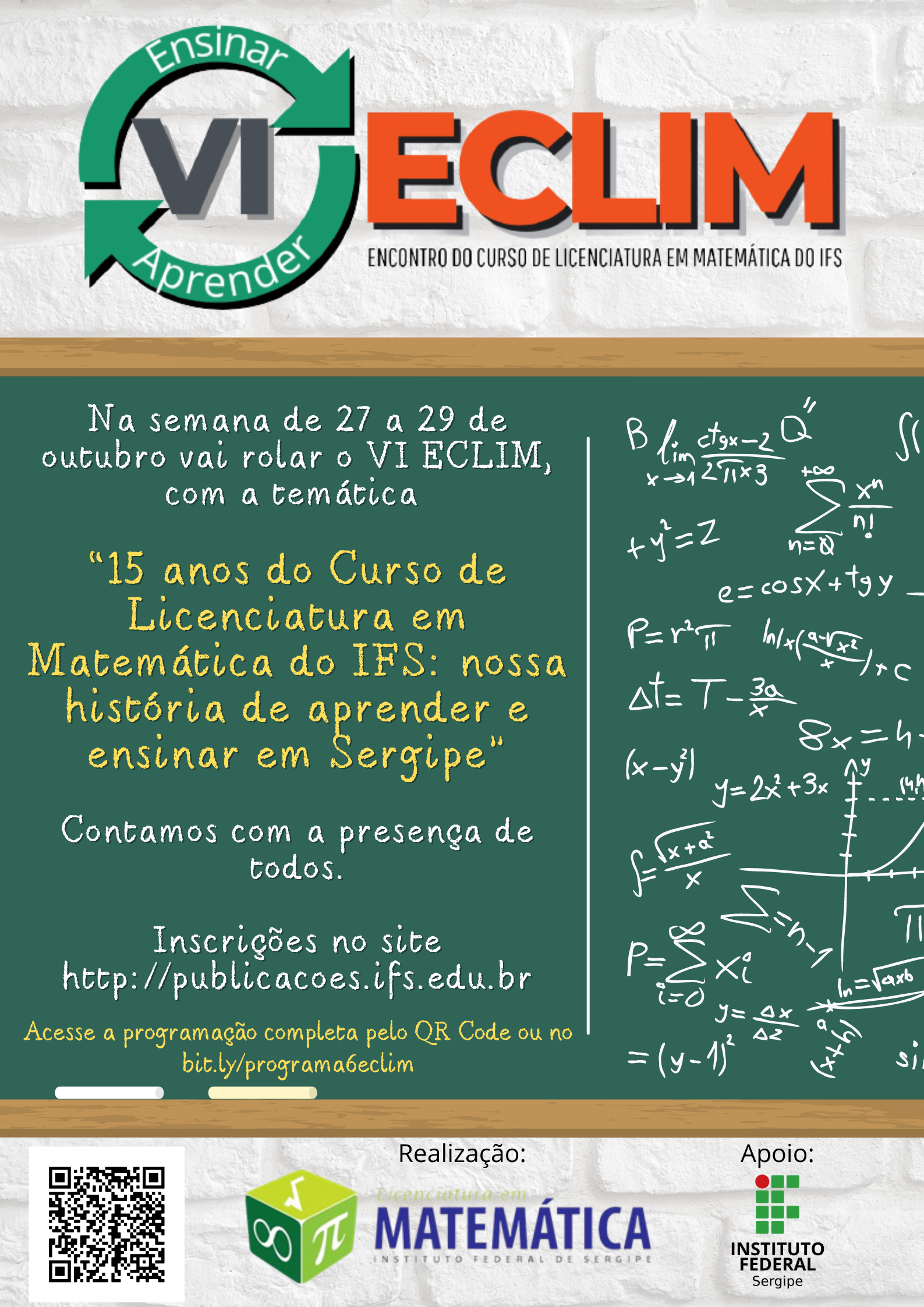 O Instituto Federal de Sergipe, campus Aracaju, realizará, de 27 a 29/10, o VI Encontro do Curso de Licenciatura em Matemática (ECLIM). Nesta sexta edição, o evento proporcionará aos participantes um espaço de reflexão e troca de saberes acerca de temas relevantes no cenário atual da Matemática, por meio de atividades como palestras, mesa redonda e feira virtual.