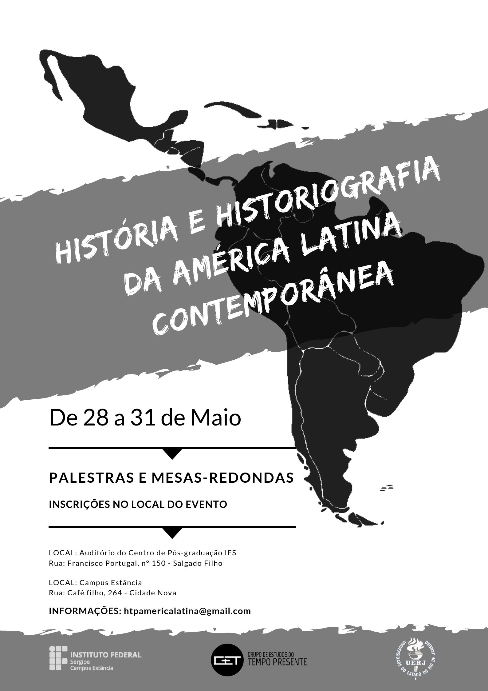 A análise de acontecimentos-chave da História Contemporânea da América Latina é a temática do seminário realizado pelo Instituto Federal de Sergipe (IFS) - Campus Estância, em parceria com o Grupo de Estudo do Tempo Presente da Universidade Federal de Sergipe (GET/UFS/CNPq) e a Universidade Estadual do Rio de Janeiro (UERJ). A programação vai de 28 a 31 de maio e inclui palestras, debates, workshop, oficinas, lançamento de livro e atividade cultural.