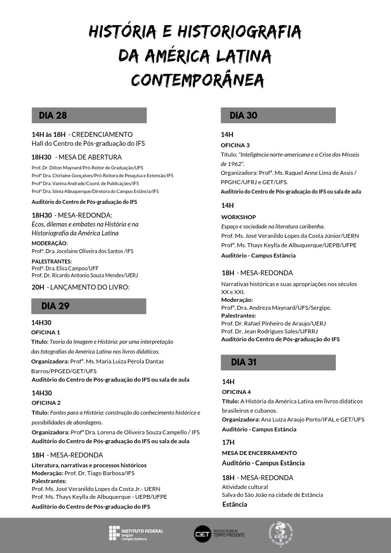 Integram a programação as mesas-redondas: Ecos, dilemas e embates na História e na Historiografia da América Latina; Teoria da Imagem e História: por uma interpretação das fotografias da América Latina nos livros didáticos; Fontes para a História: construção do conhecimento histórico e possibilidades de abordagens; Literatura, narrativas e processos históricos; Inteligência norte-americana e a Crise dos Mísseis de 1962; Narrativas históricas e suas apropriações nos séculos XX e XXI e A História da América Latina em livros didáticos brasileiros e cubanos.