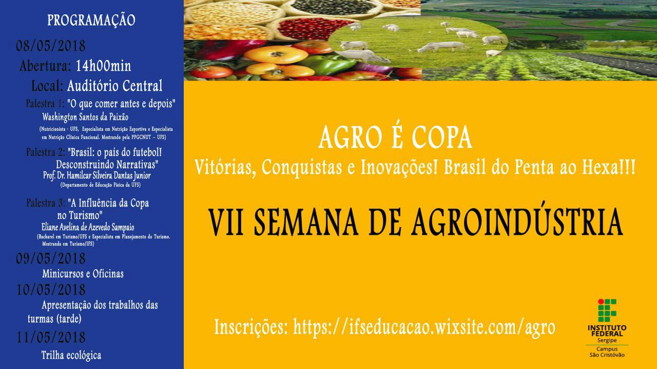 Com o tema Agro é Copa: vitórias, conquistas e inovações! Brasil do penta ao hexa!, o evento usa o mote desportivo para oferecer uma programação diversificada que compreende, entre outras pautas, nutrição esportiva, trilha ecológica, além de minicursos de artes marciais e oficinas de fit dance. Conforme Emanuele Cerqueira, docente, a Semana contemplará condutas que contribuirão para a formação técnica dos estudantes, com a busca da expansão e aprofundamento do saber nas áreas interligadas à Agroindústria. Propõe, ainda, oferecer aos participantes atualização da temática, compartilhar experiências com especialistas da área de alimentos, bem como divulgar trabalhos desenvolvidos pelos alunos do curso.