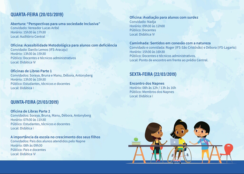 "A participação das pessoas que integram a comunidade do Campus, incluindo docentes, técnicos, estudantes e familiares, demonstra que ela entende como necessárias à atualização de práticas metodológicas, a ampliação das formas de atendimento ao público e a convivência plena entre as pessoas. Não é apenas questão de direitos, mas do respeito à liberdade de conhecer e estudar das pessoas com necessidades específicas", ressalta a psicóloga do campus e coordenadora do NAPNE Ana Cecília Campos, que convida a comunidade acadêmica a prestigiar o evento e contribuir para a construção de uma escola inclusiva e uma sociedade melhor!