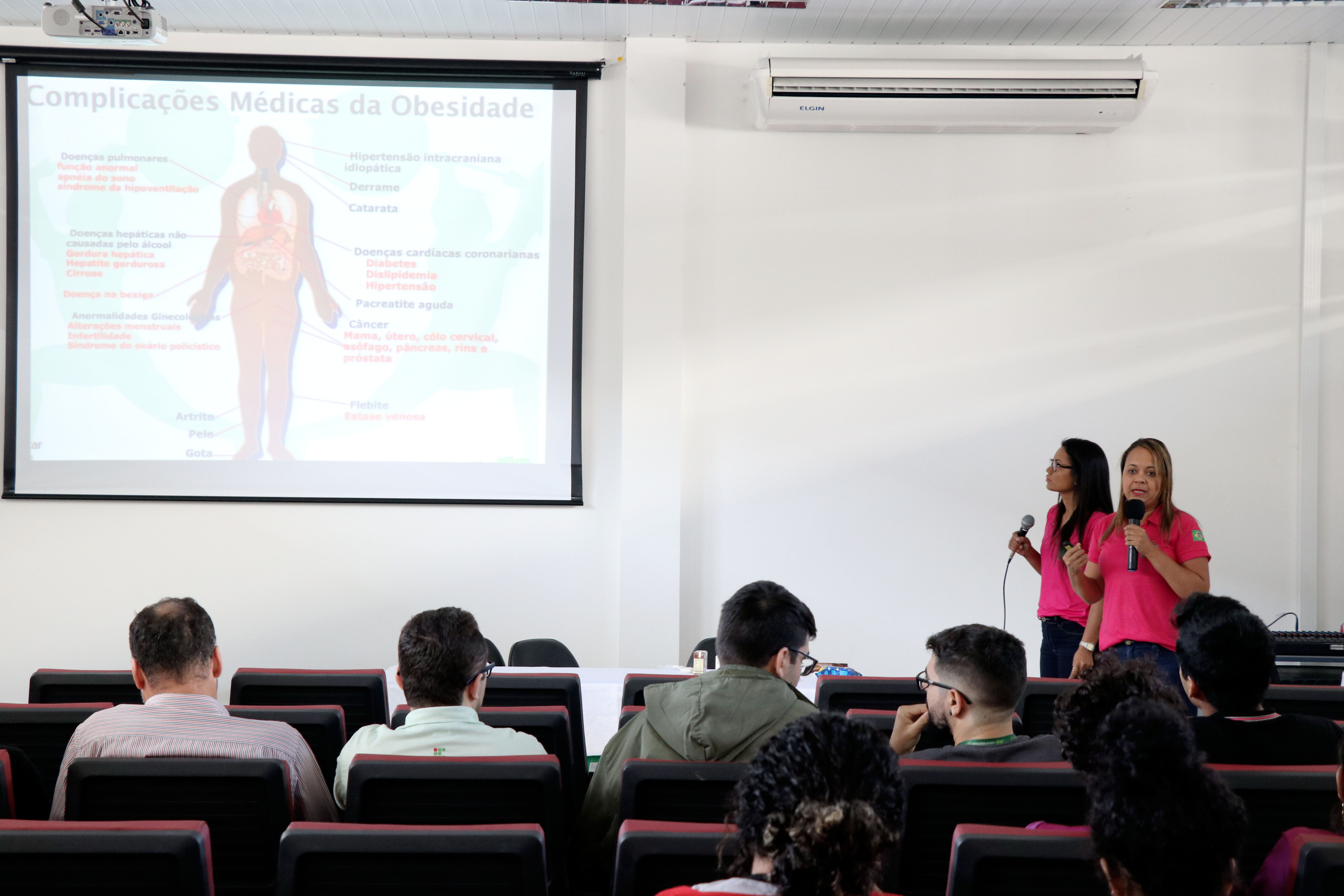 A palestra sobre alimentação saudável foi ministrada pelas nutricionistas Cristiani Brandão e Jaqueline Reis e abordaram assuntos sobre os alimentos e os seus nutrientes, observaram a produção industrializada e a quantidade de sal, açúcar e óleo que nela contém e desta forma prenderam a atenção do público. “O objetivo da palestra foi mostrar a importância da alimentação e a prática de exercício físico para evitar doenças”, explica Cristiani sobre a questão de que as pessoas não devem apenas se preocupar com a obesidade como uma questão de estética, mas sim como prevenção de doenças.