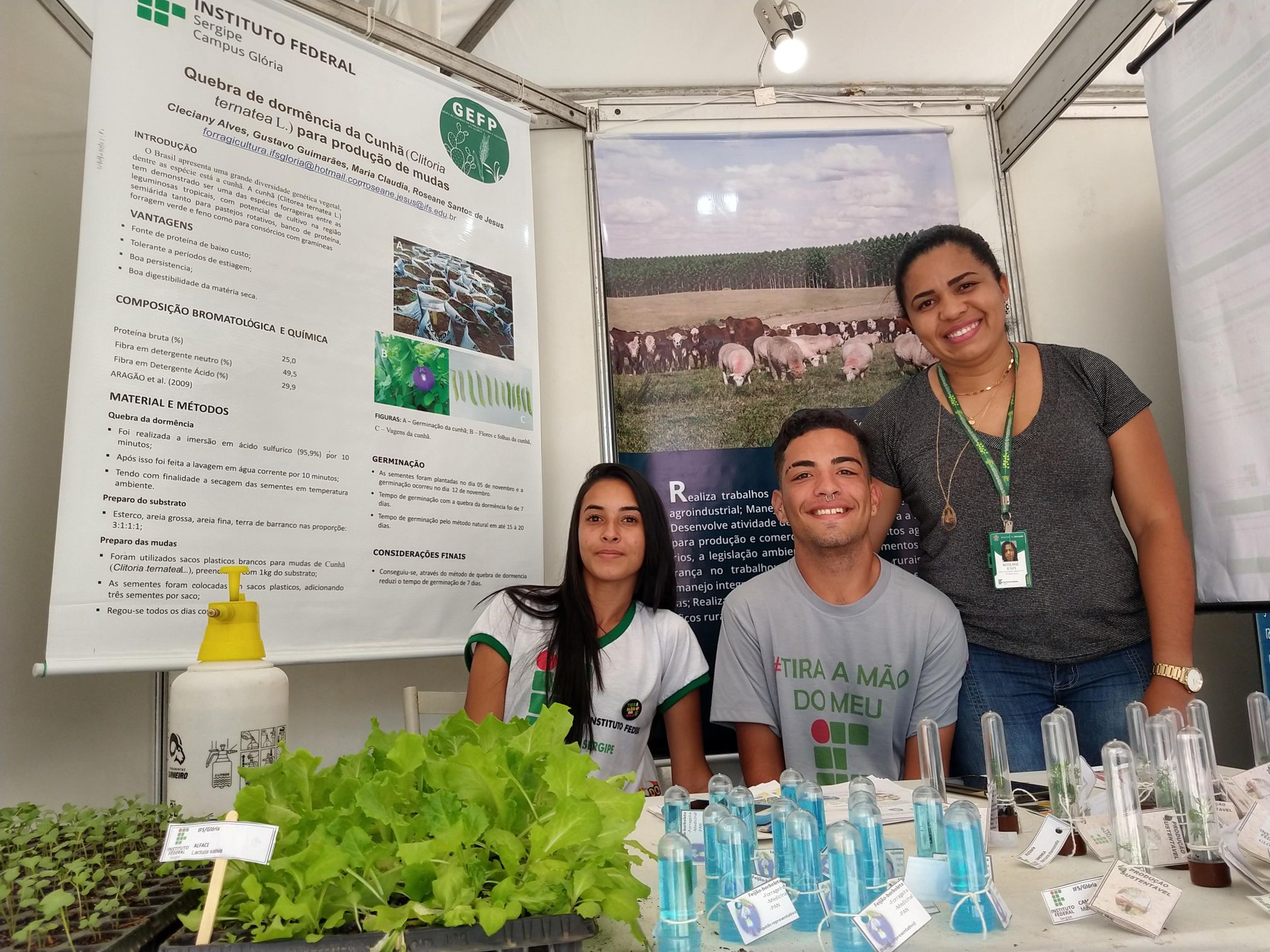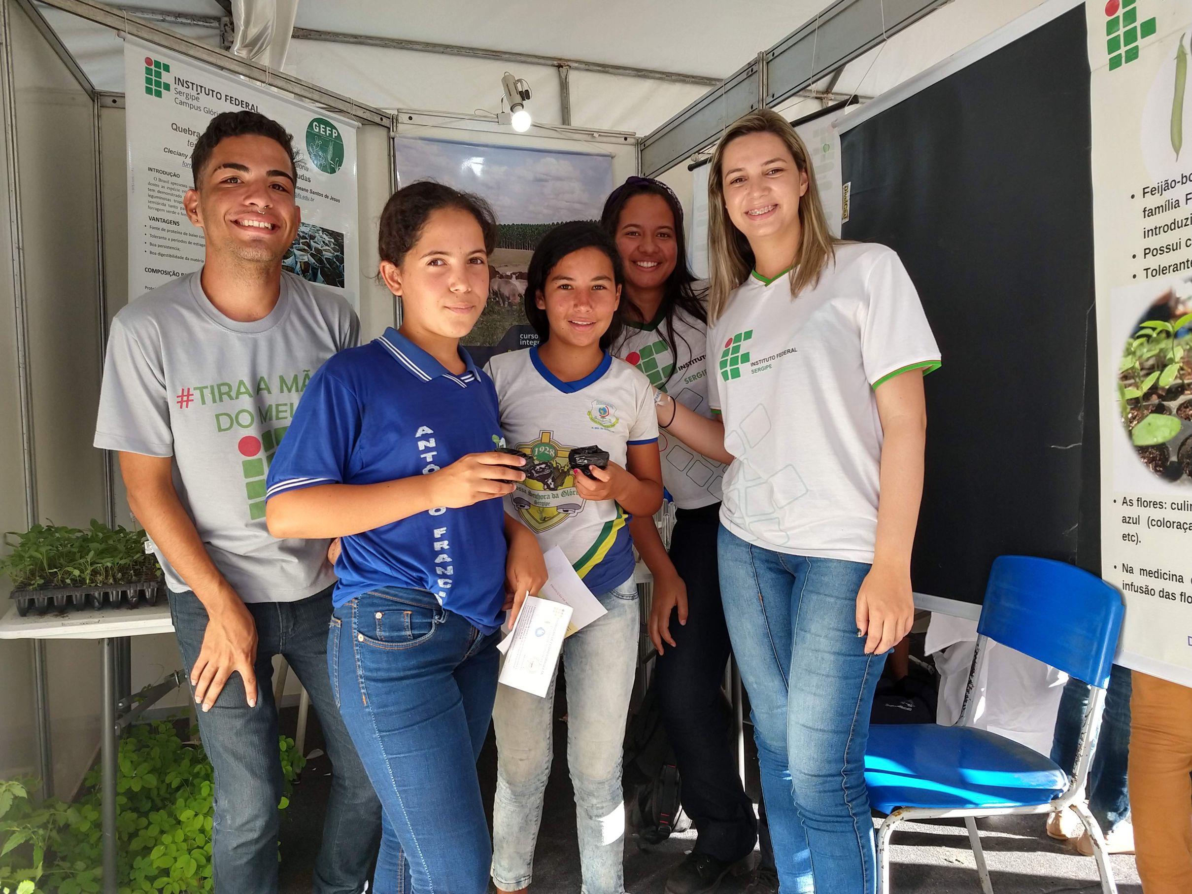Ao lado, encontrava-se o stand do curso Técnico Integrado em Agropecuária referentes às disciplinas Agroecologia e Produção Vegetal II, nele os alunos do 1º e 2º anos expuseram mudas de morango, feijão-borboleta e moringa e fizeram distribuição de mudas de camomila, alface, tomate e couve-manteiga produzidas no campus.