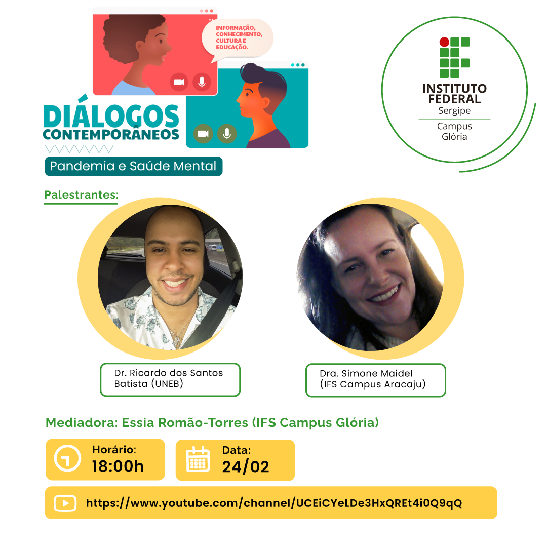 A roda de conversa terá início às 18h, no canal do YouTube do IFS Campus Glória e contará com duas palestras “Pandemias na história e na contemporaneidade: aspectos políticas e sociais” com o Prof. Dr. Ricardo dos Santos Batista da Universidade do Estado da Bahia - UNEB e “Aprendendo a lidar com a saúde mental em tempo de pandemia” com a Profª. Dra. Simone Maidel do IFS/Campus Aracaju..A mediação será da Profª. Ma. Essia de Paula Romão-Torres, lotada no IFS/Campus Glória e autora do projeto.
