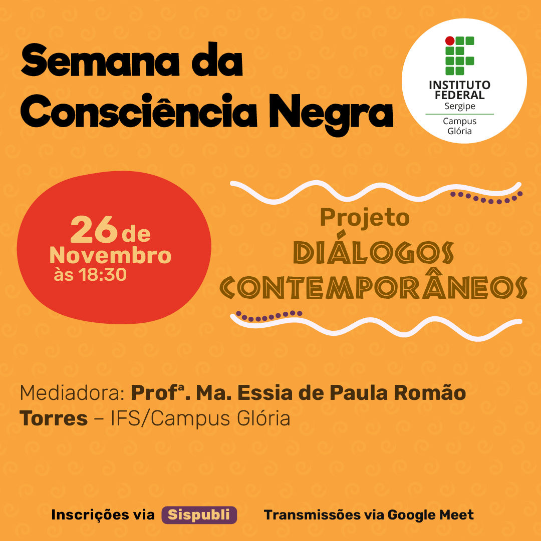 Já no dia 26 de novembro, às 18h, acontece a primeira roda de conversa da 2ª edição do projeto Diálogos Contemporâneos que também irá compor a programação do evento “Novembro Negro: Sankofa - Identidades Afrodiaspóricas” com duas palestras sobre o tema “Negritude”: “Projeto de nação brasileira e a negação da identidade negra” com a Profa. Ma. Ana Célia Barbosa Guedes e “O racismo estrutural na representação midiática brasileira” com o Relações Públicas Me. Hericley Serejo Santos, ambos servidores do Instituto Federal do Pará. A roda de conversa terá como mediadora a Profª. Ma. Essia de Paula Romão Torres do IFS/Campus Glória e autora do projeto.
