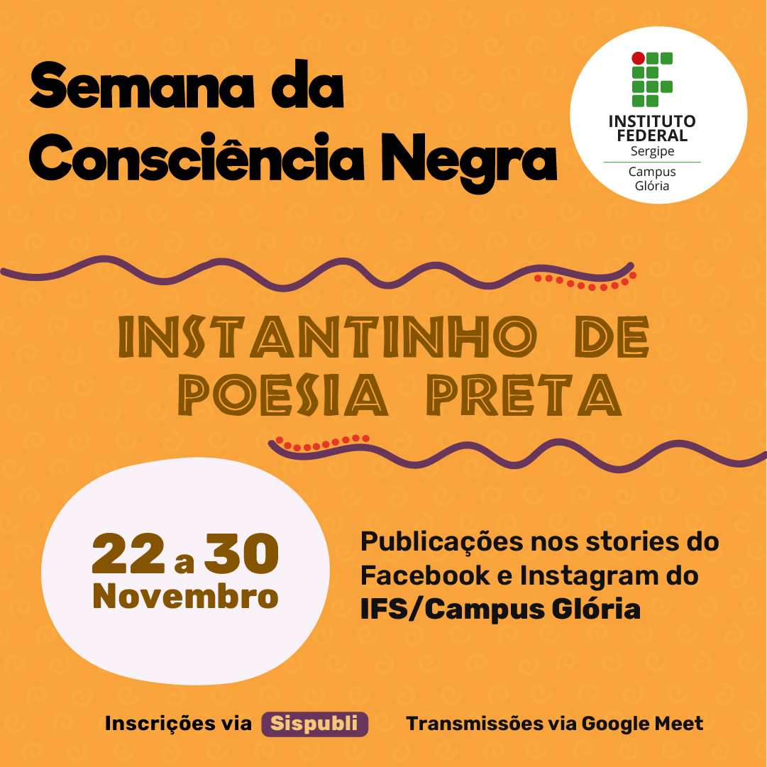 A programação do evento segue, ainda, com mais duas atividades até o final deste mês, com o Instantinho de Poesia Preta, publicações de vídeos com poesias de escritoras e escritores pretas e pretos nas redes sociais do Campus Glória. Os interessados em participar devem enviar, pelo direct do Instagram do campus, um vídeo, com orientação de tela em posição vertical e duração média de 1 minuto, recitando um poema de uma autora ou autor preta ou preto ou ainda uma poesia autoral sobre a temática da Consciência Negra. Os vídeos serão publicados até o dia 30 de novembro.