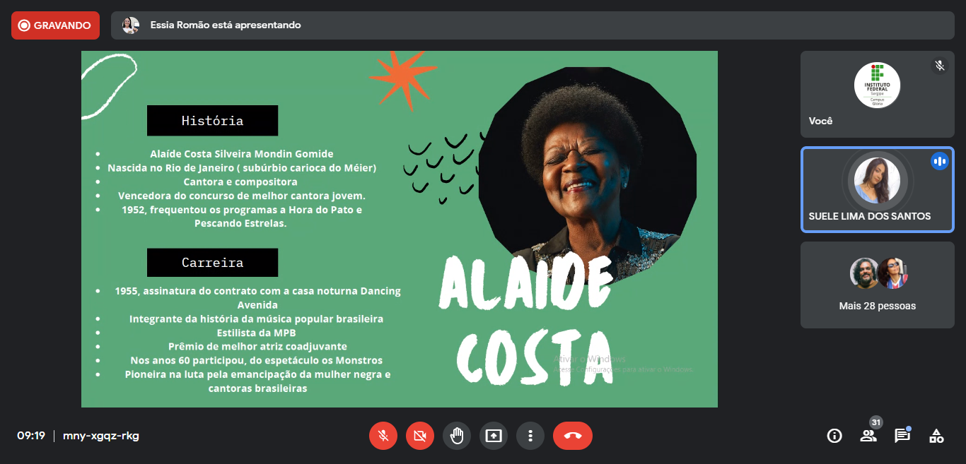 Dentro da programação do dia 20 de novembro, as discentes Ana Luiza Caldas e Kauany Oliveira e os discentes Felipe Jordan Alves e Maycon Oliveira do 1º ano B do curso Técnico Integrado em Agropecuária apresentaram uma pesquisa sobre a vida e a obra da desembargadora, poeta e ficcionista cabo-verdiana, Vera Duarte Pina, a qual é formada em Direito pela Universidade Clássica de Lisboa. Membro das Academias Caboverdiana de Letras e de Ciências de Lisboa e membro correspondente da Academia Gloriense de Letras. Possui diversos títulos publicados, entre ensaios, contos, prosa, poesia, crônicas e ficção, sendo a sua obra mais recente, o romance A Vênus Crioula (2021)..