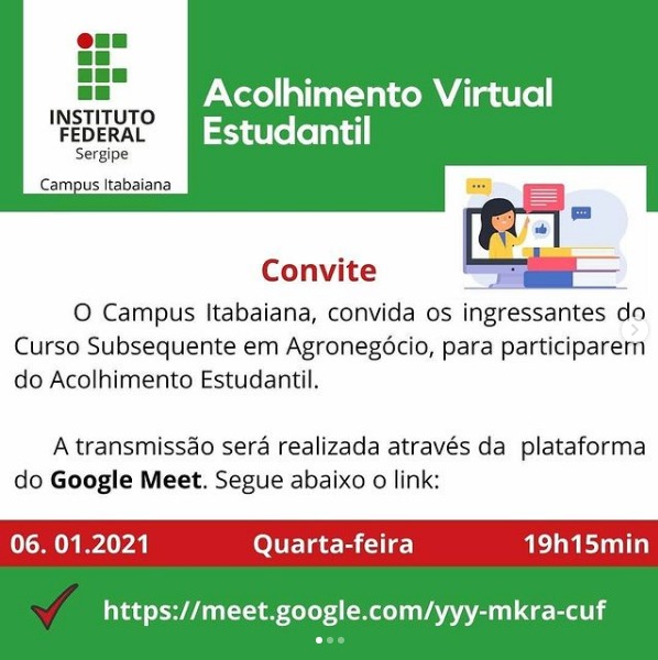 O campus Itabaiana dedicou os dias 6 e 7 deste mês para realizar o acolhimento estudantil dos alunos do curso subsequente em Agronegócio. As atividades, realizadas por meio da plataforma Google Meet, incluíram um momento cultural, a apresentação do corpo docente, dos membros da equipe multidisciplinar e dos alunos, a apresentação do curso e um bate-papo sobre a atuação profissional do técnico em Agronegócio. No segundo dia, o minicurso “Introdução ao Google Classroom: Meet e Gmail” foi ministrado pelo professor Levi da Costa Mota, com o intuito de orientar os alunos acerca do início do ensino remoto.