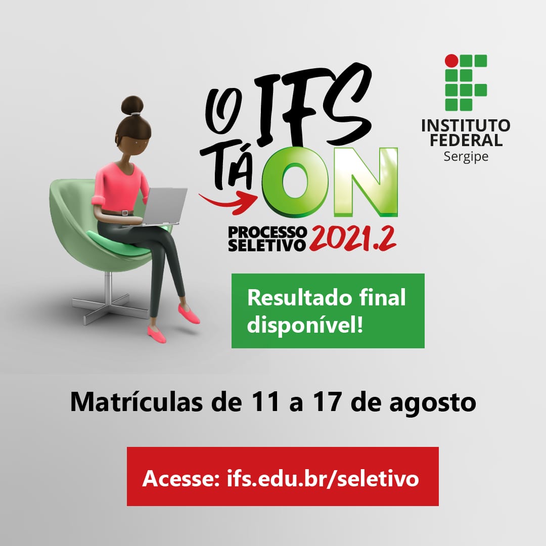 O Instituto Federal de Sergipe (IFS), através da Diretoria de Gestão de Ingresso (DGI), publicou o resultado final do Processo Seletivo 2021.2, para preenchimento de vagas em cursos técnicos subsequentes e de graduação. Foram ofertadas mais de 1.300 vagas em oito campi da capital e do interior do estado. Os aprovados terão o período de 11 a 17 de agosto para efetuar sua matrícula, de forma on-line (via sistema) ou presencial.