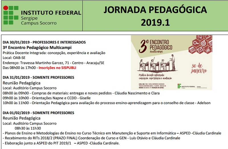 De 30 de janeiro a 01 de fevereiro acontece a Jornada Pedagógica do Campus Socorro. O evento é realizado no início de cada ano letivo, e marca o retorno das férias. Na ocasião, são realizadas diversas atividades voltadas à troca de experiências entre docentes e técnicos, a fim de contribuir para o constante aprimoramento dos processos de ensino-aprendizagem do campus.