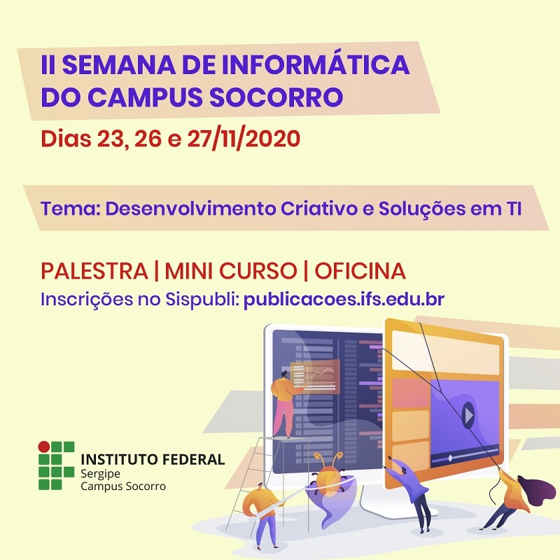 O Campus Socorro realizou nos dias 23, 26 e 27 de novembro a sua II Semana de Informática, destinada a promover palestras, oficinas e minicursos para os estudantes do Curso de Manutenção e Suporte em Informática sobre temáticas relacionadas aos conteúdos trabalhados no decorrer do curso. Além dos alunos do campus, também estiveram presentes acadêmicos de outras unidades do IFS, técnicos administrativos, professores e gestores do campus.
