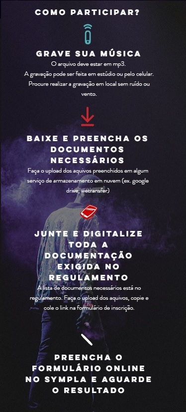 Cada participante ou grupo poderá inscrever apenas uma canção, para uma das eliminatórias à sua escolha. A música inscrita será analisada e passará por uma pré-seleção e, se classificado, irá participar da fase eliminatória indicada no ato da inscrição. Já as músicas participantes deverão ser inéditas, não podem ter sido gravadas em trabalhos de cunho comercial e/ou divulgadas. Serão aceitos gêneros e estilos livres que auxiliem na promoção do crescimento intelectual, colaborando para a formação de sujeitos críticos, éticos e conscientes.