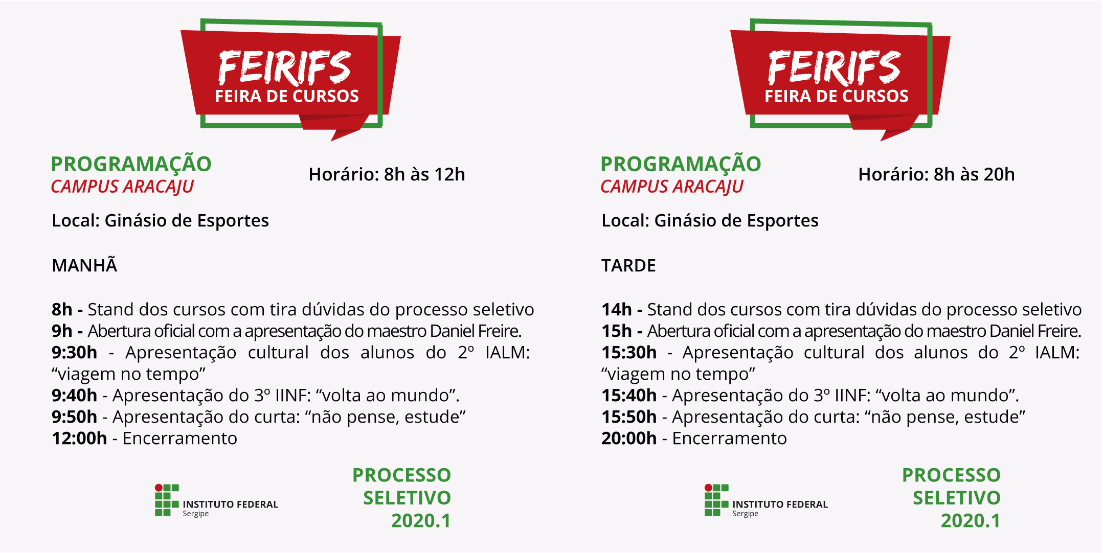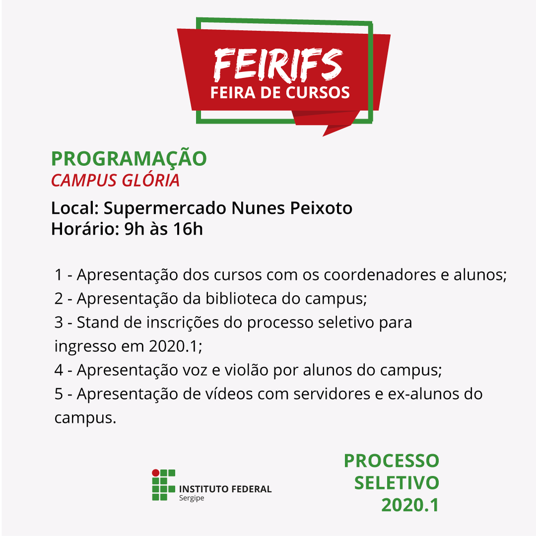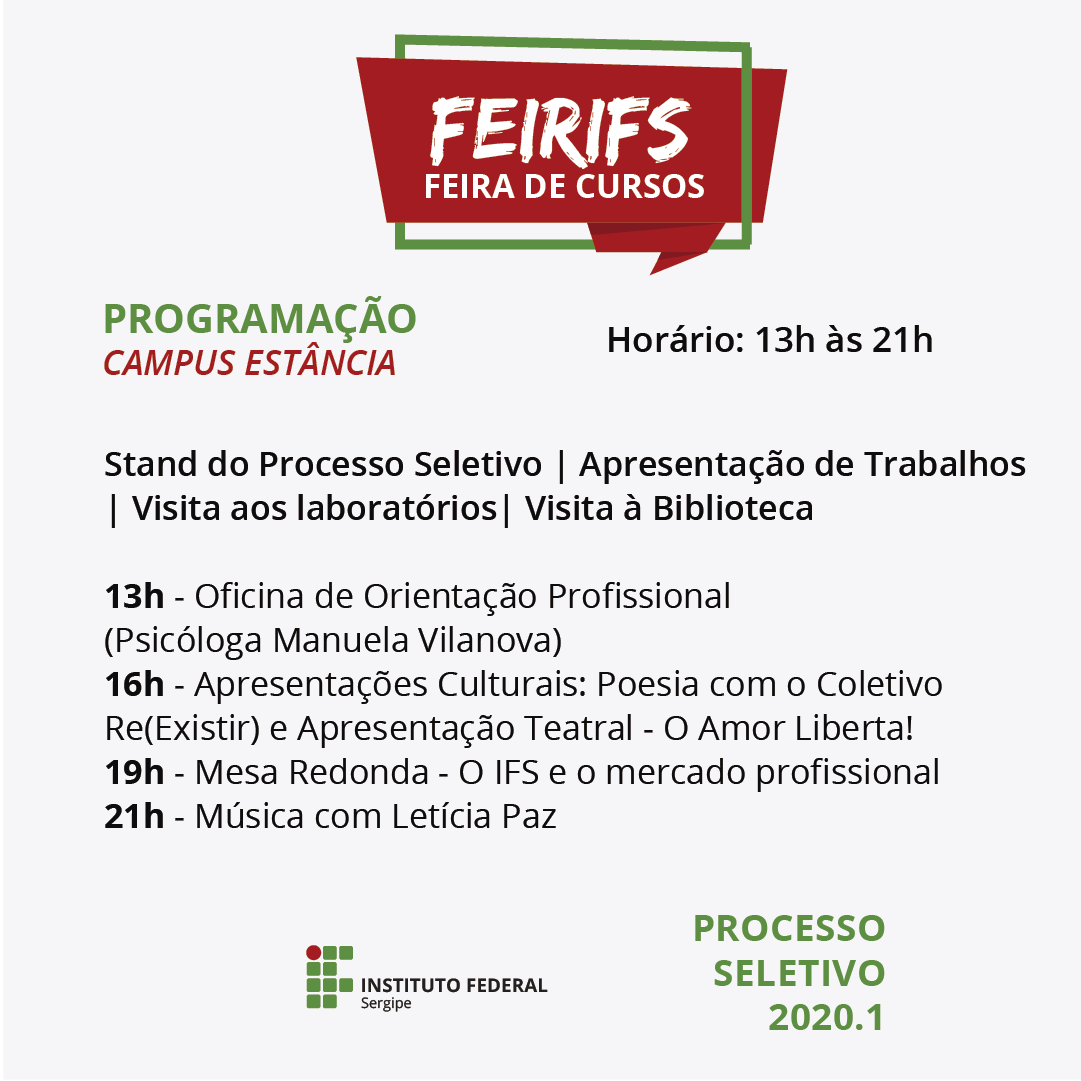 No dia 18 de setembro, será realizada a 1ª Feira de Cursos (FeirIFS), que ocorrerá simultaneamente nos campi Aracaju, Socorro, São Cristóvão, Estância, Tobias Barreto, Propriá, Itabaiana e Glória.