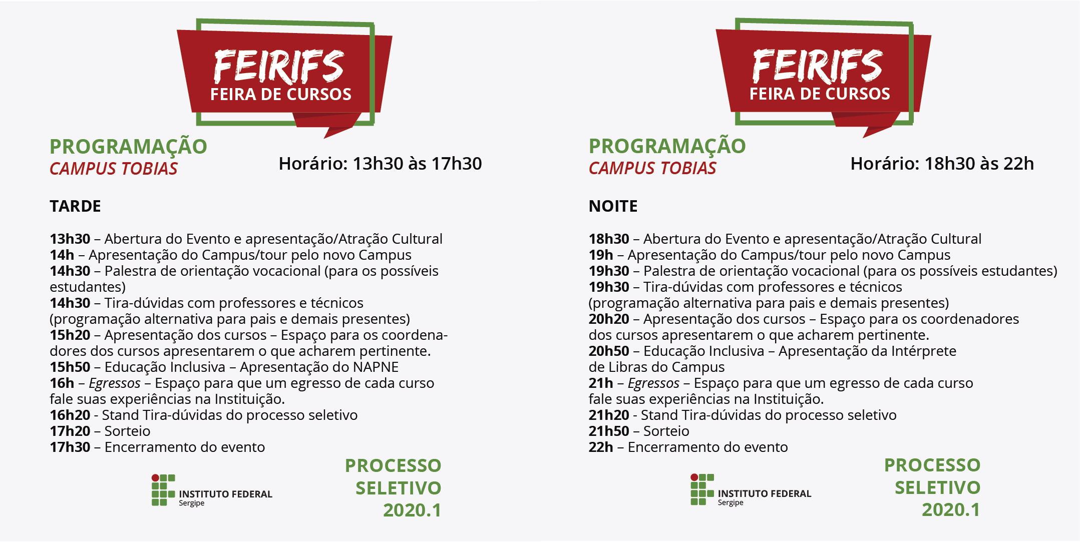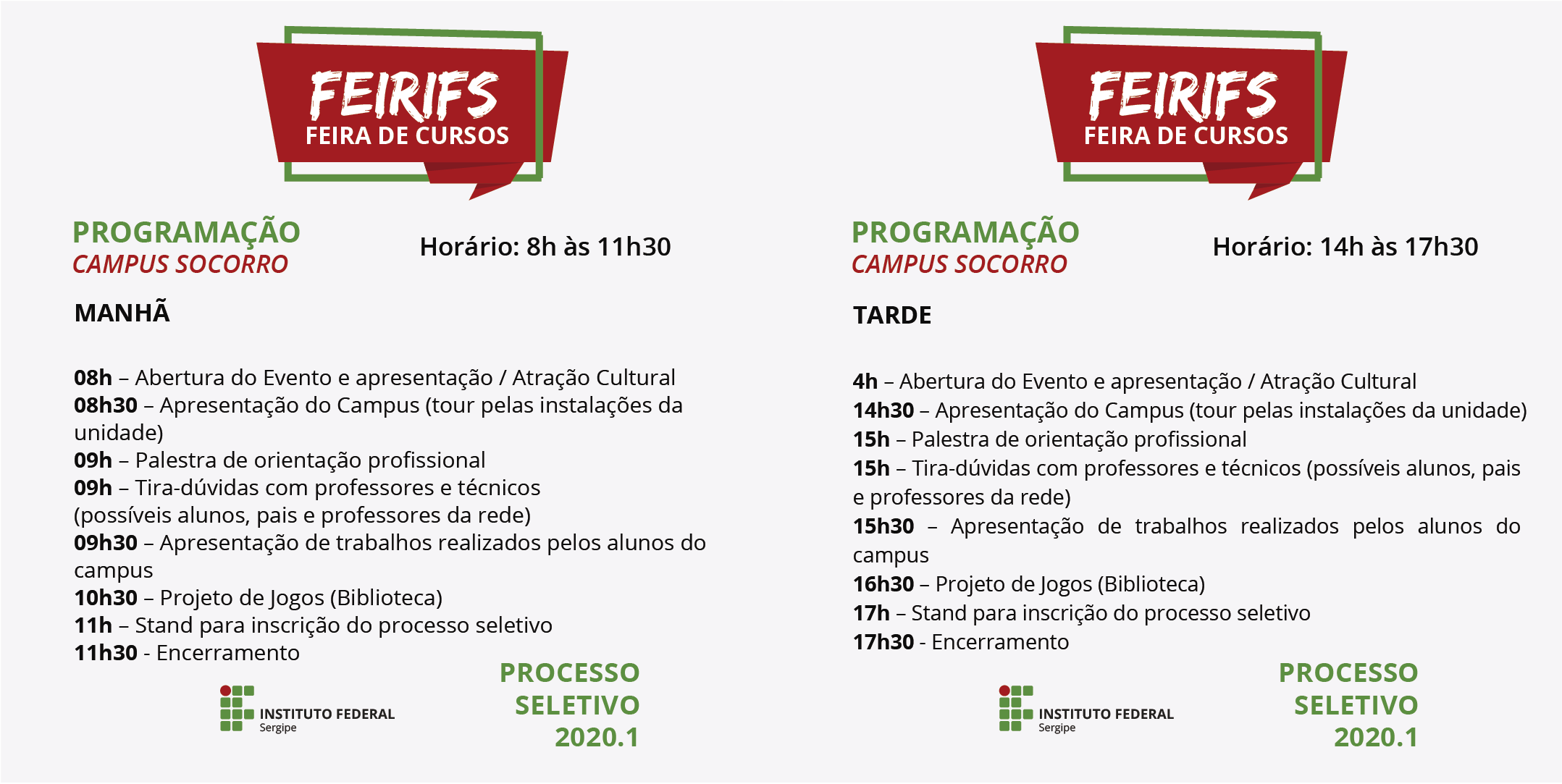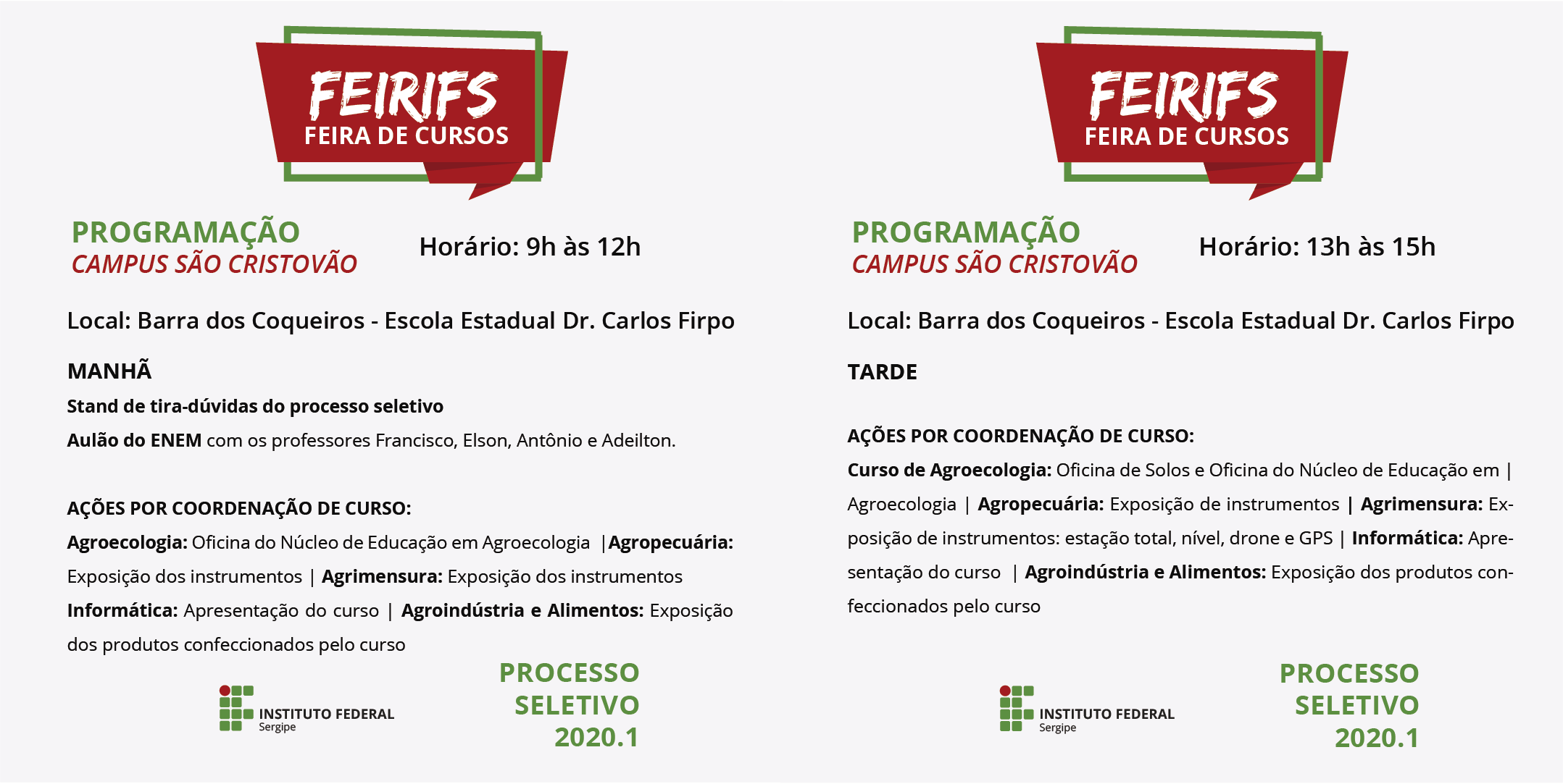 No dia 18 de setembro, será realizada a 1ª Feira de Cursos (FeirIFS), que ocorrerá simultaneamente nos campi Aracaju, Socorro, São Cristóvão, Estância, Tobias Barreto, Propriá, Itabaiana e Glória.