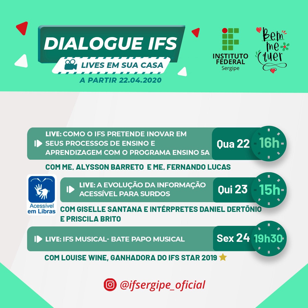 A adesão da comunidade ao Dilogue IFS, atividade organizada pela equipe de Comunicação Social do Instituto Federal de Sergipe durante a quarentena, foi tão positiva que no período de 22 a 24 de abril será realizada uma nova programação de lives no perfil do Instagram @ifsergipe_oficial. Mantendo a variedade de temáticas, a equipe organizadora preparou três lives ligadas às áreas de ensino, acessibilidade e cultura.