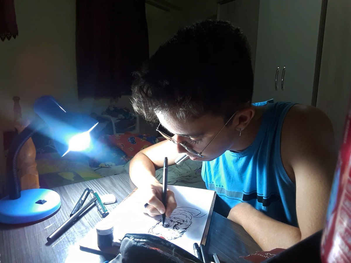 O estudante relata que tem aproveitado esse período em casa para aprimorar técnicas que já conhecia e testar outras novas, já que, durante as aulas, a rotina de estudos faz com que ele só consiga desenhar aos finais de semana. “Além de focar no acabamento dos desenhos, consegui concluir minha primeira história em quadrinhos e também tenho me aventurado no universo da pintura e da escultura. Eu já tinha comprado o material para essas duas últimas formas de expressão, mas ainda não tinha colocado a mão na massa por falta de tempo”, comenta o jovem artista plástico, que começou a desenhar por volta dos 11 anos inspirado em mangás.