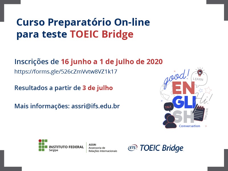Até o dia 1º de julho estão as inscrições para o Curso Preparatório On-Line para Teste TOEIC Bridge. São ofertadas 20 mil vagas gratuitas para toda a Rede Federal de Educação Profissional, Científica e Tecnológica, incluindo servidores (professores e técnicos) e alunos regularmente matriculados no IFS.
