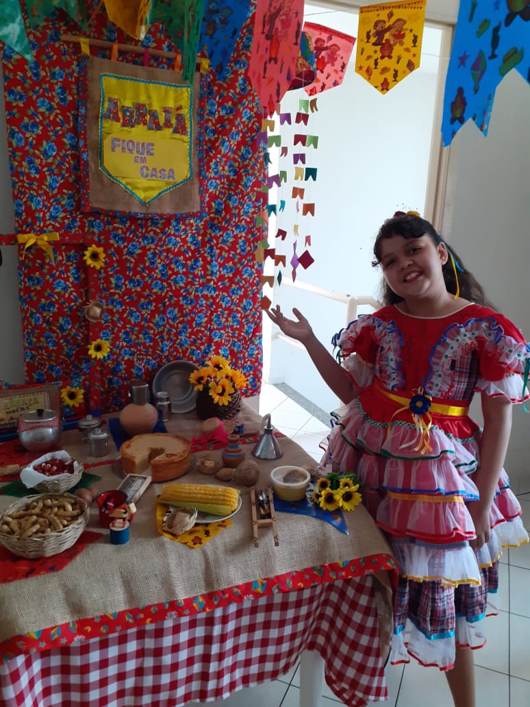 É o caso de Hortência Moura, administradora do Campus Aracaju. Todos os anos ela providencia a decoração do setor onde que trabalha, junto com os colegas, e da própria casa, fabricando itens e montando cenários. Diante da necessidade de quarentena dos servidores, que estão trabalhando em revezamento, não houve a decoração no local de trabalho, mas ela adaptou um cenário na varanda de casa para curtir os festejos juninos com o núcleo familiar: filha, esposo e mãe.