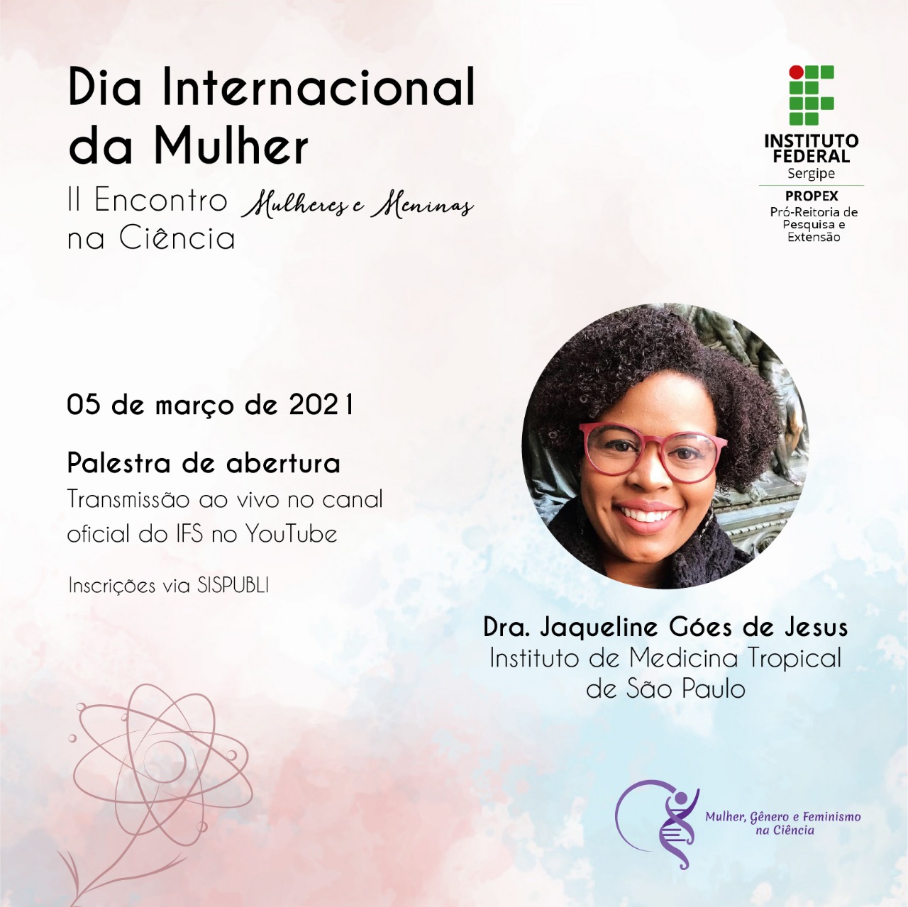 Jaqueline Góes - cientista que fez parte da equipe responsável pela sequenciação do primeiro genoma do vírus SARS-CoV-2, quando confirmado o primeiro caso de Covid-19 no Brasil. “Teremos também uma mesa-redonda, com a apresentação dos projetos institucionais que fizeram parte do edital Mulheres na Ciência. O objetivo da mesa será socializar os resultados das pesquisas aplicadas nos campi”, revela Mariana Barreto, coordenadora de Apoio à Pesquisa do IFS e uma das organizadoras do evento.