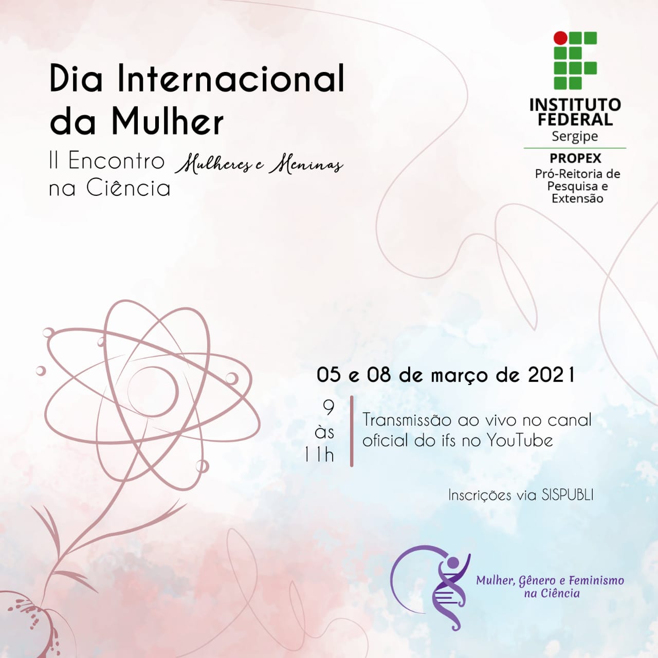 O 8 de março é conhecido internacionalmente como Dia da Mulher. A data é simbólica e representa a reivindicação de direitos, sendo consequência de um processo de luta social, política e histórica. É nesta ótica que o Instituto federal de Sergipe (IFS) realiza uma programação especial para o mês de reflexão e homenagem às mulheres. Nos dias 05 e 08 de março, o Instituto promove o II Encontro de Mulheres e Meninas na Ciência (EMMC), no canal oficial do IFS no YouTube: youtube.com/IFSergipe.